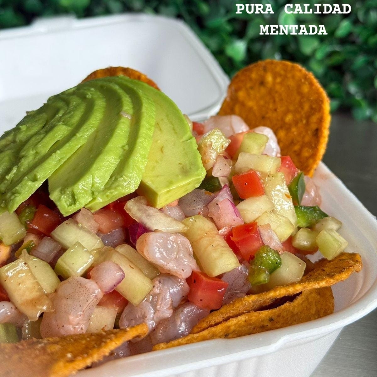 Camarón mezclado con pepino, tomate, cebolla, chile jalapeño y limón bañado con una salsa especial de la casa montado en una cama de tostitos de tu elección acompañados con una salsa picante.