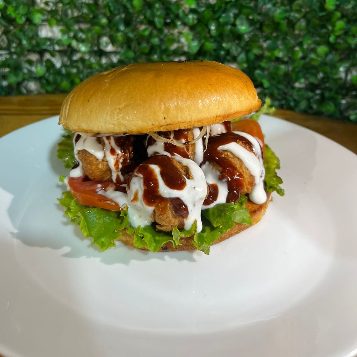 120 gr de jugosa carne de res sazonada, con camarón empanizado, queso, lechuga, tomate y pepinillos en pan Brioche y aderezo de la casa.