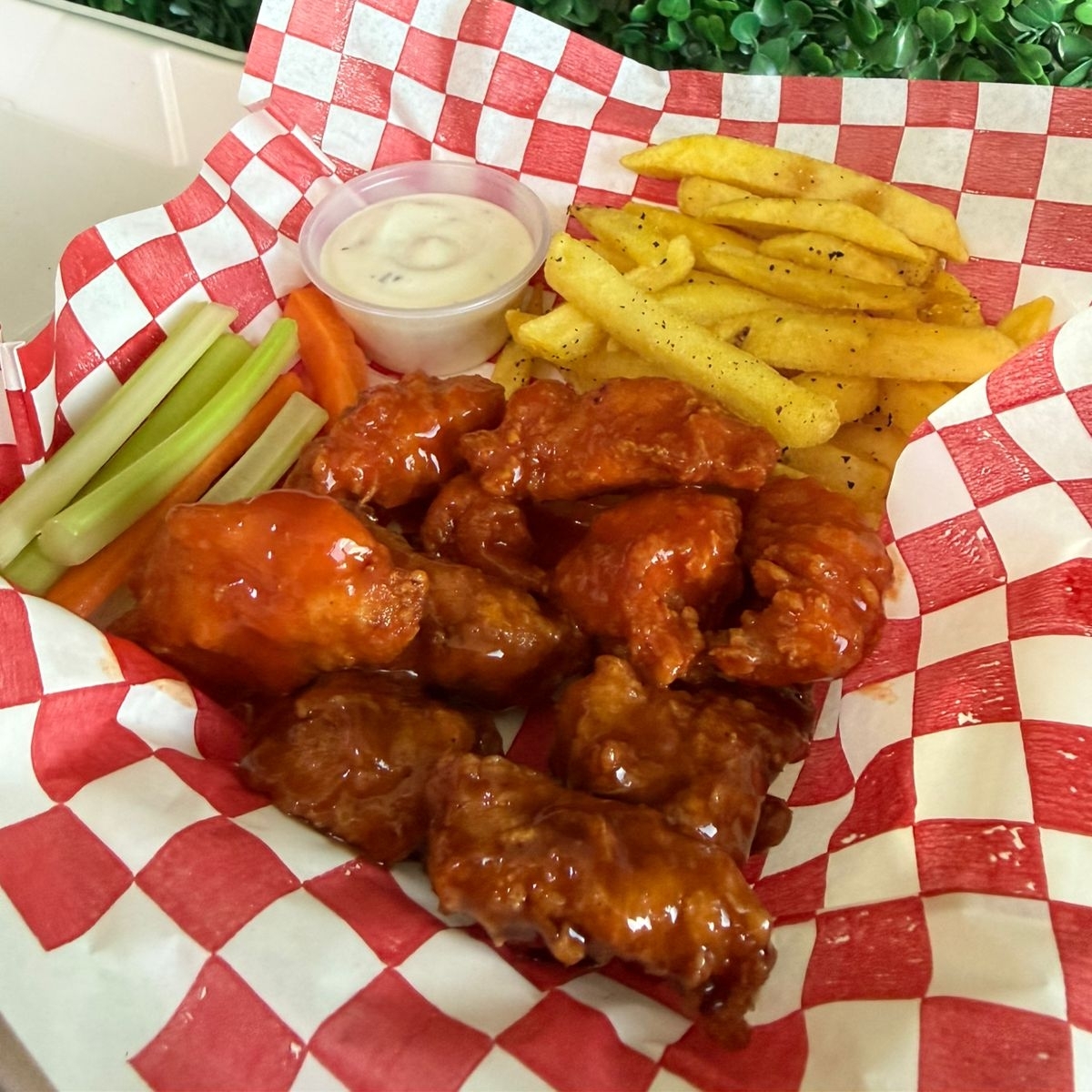 12 piezas de Boneless empanizadas y bañadas en salsa de su preferencia acompañadas de ranch, apio y zanahoria