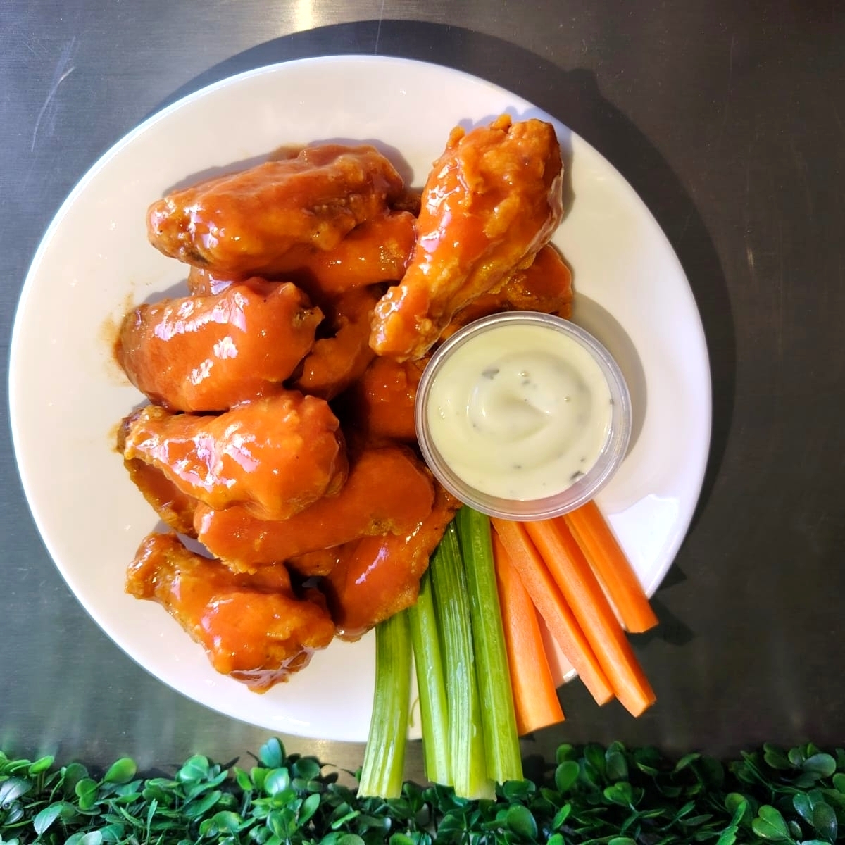 8 piezas de alitas bañadas en salsa de su preferencia acompañadas de ranch, apio y zanahoria.
