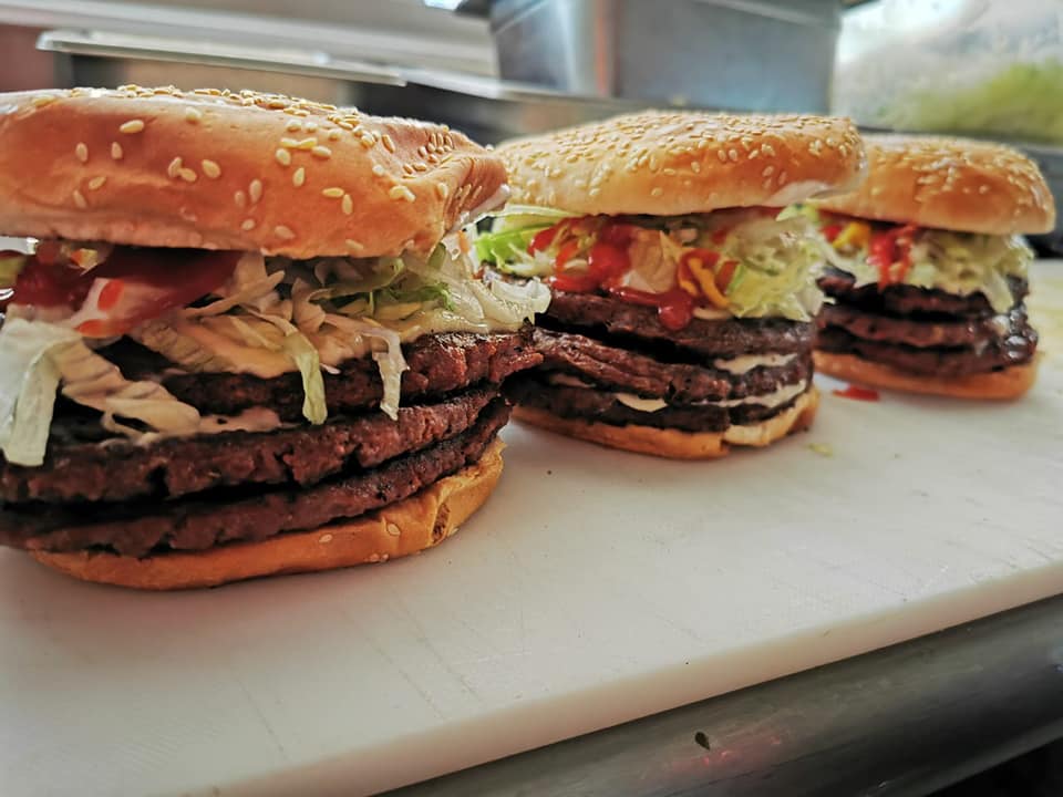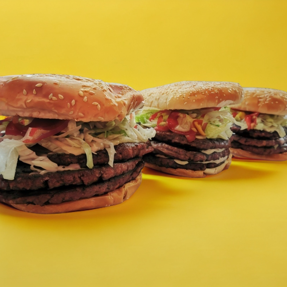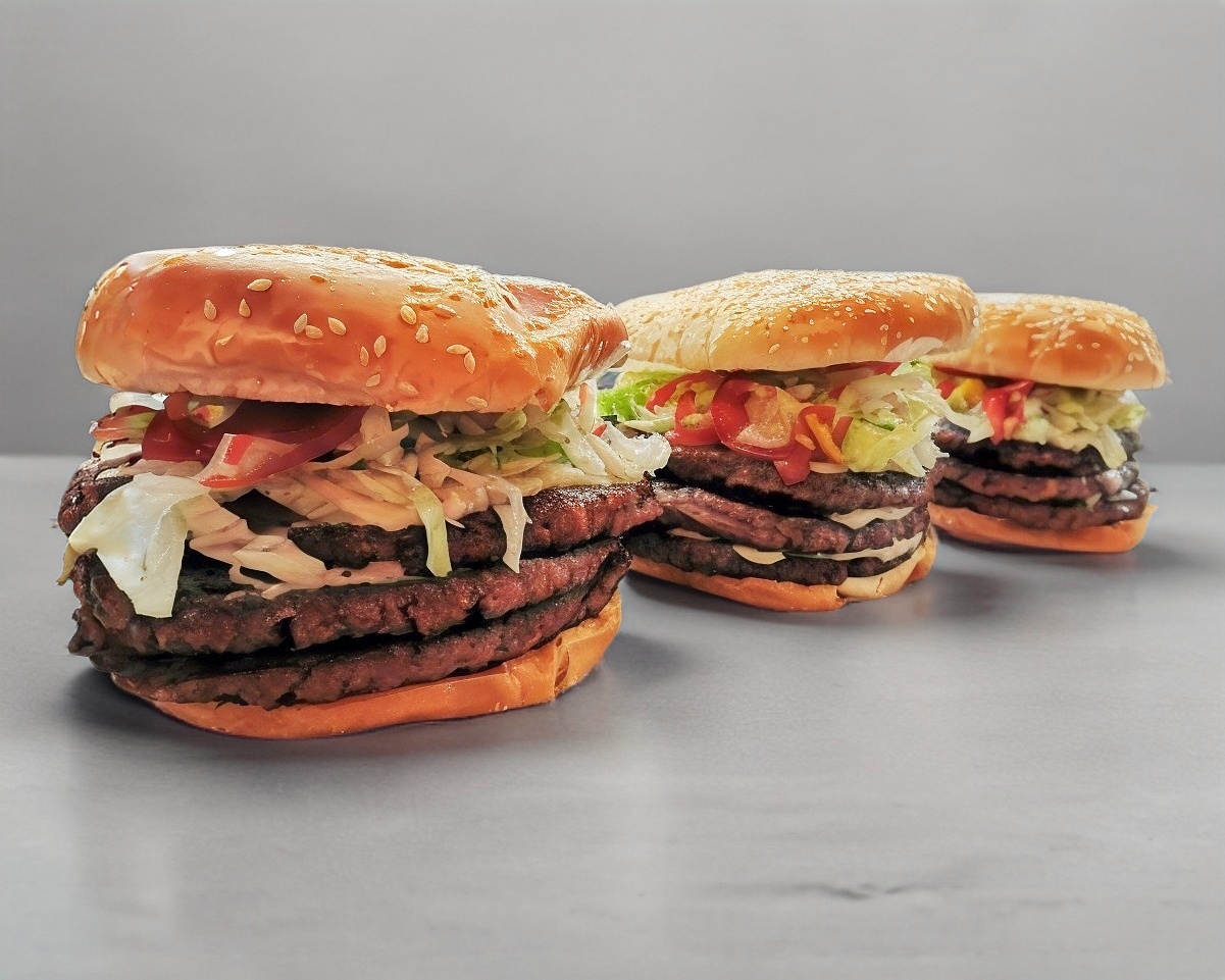 Triple carne, triple queso, lechuga, tomate, mayonesa, mostaza y catsup.