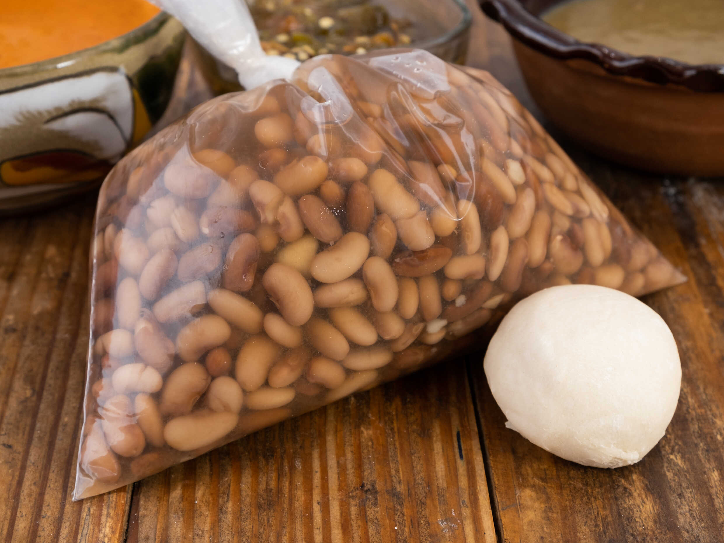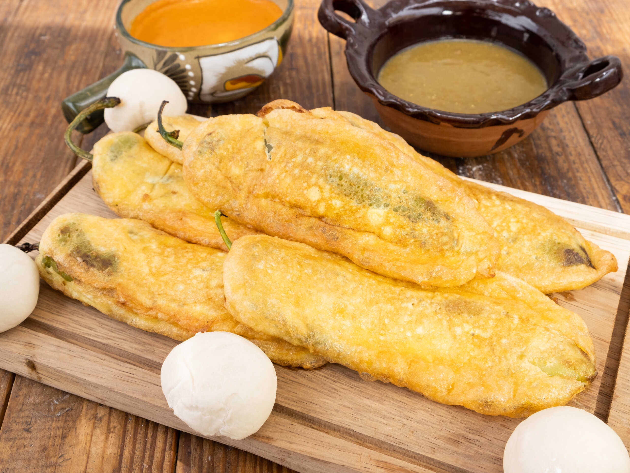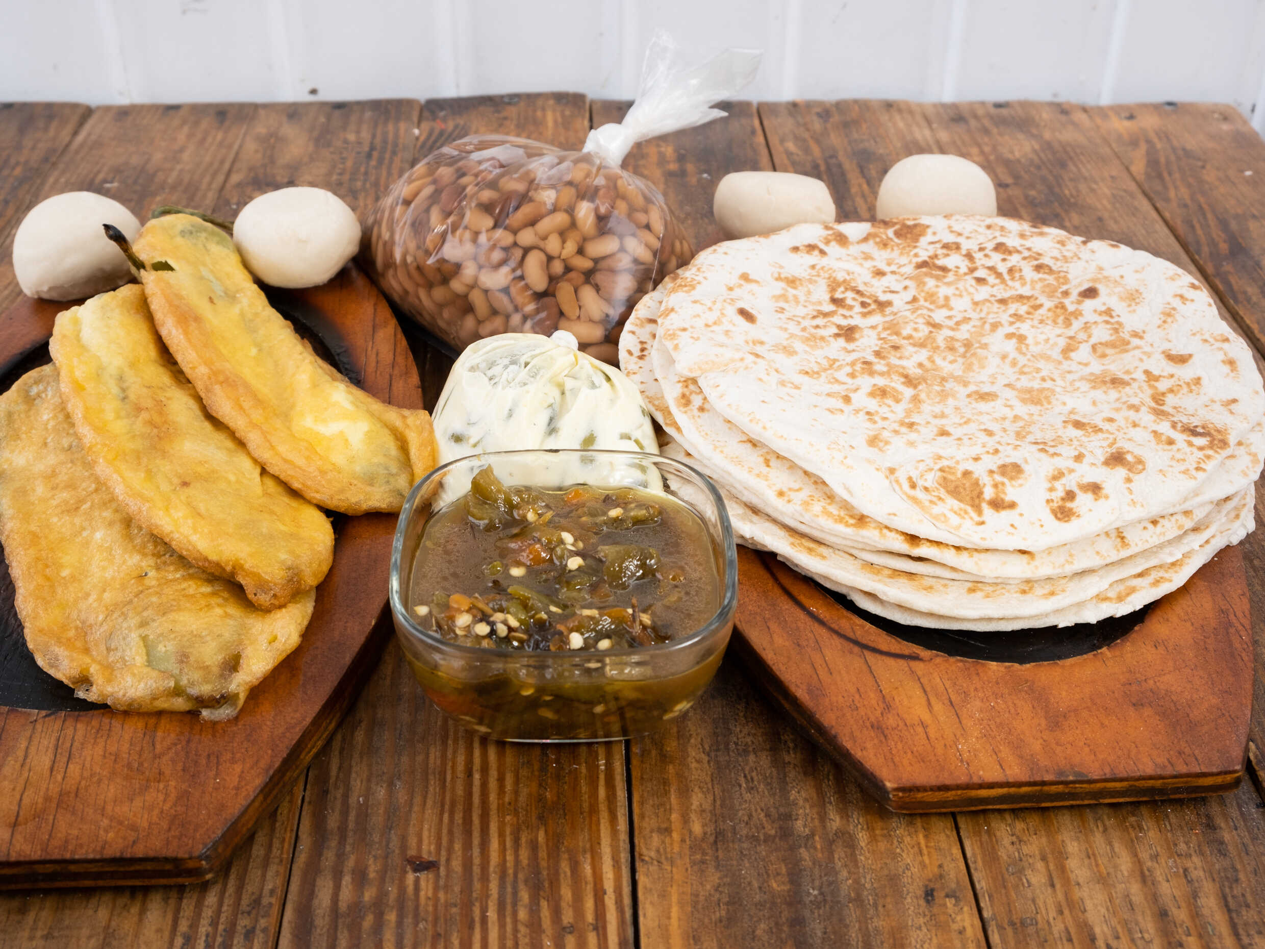 Salsa, frijoles, tortillas y 3 chiles rellenos.