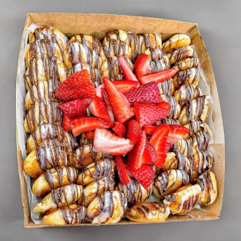 Incluye 60 mini hot cakes 2 jarabes y 2 topping