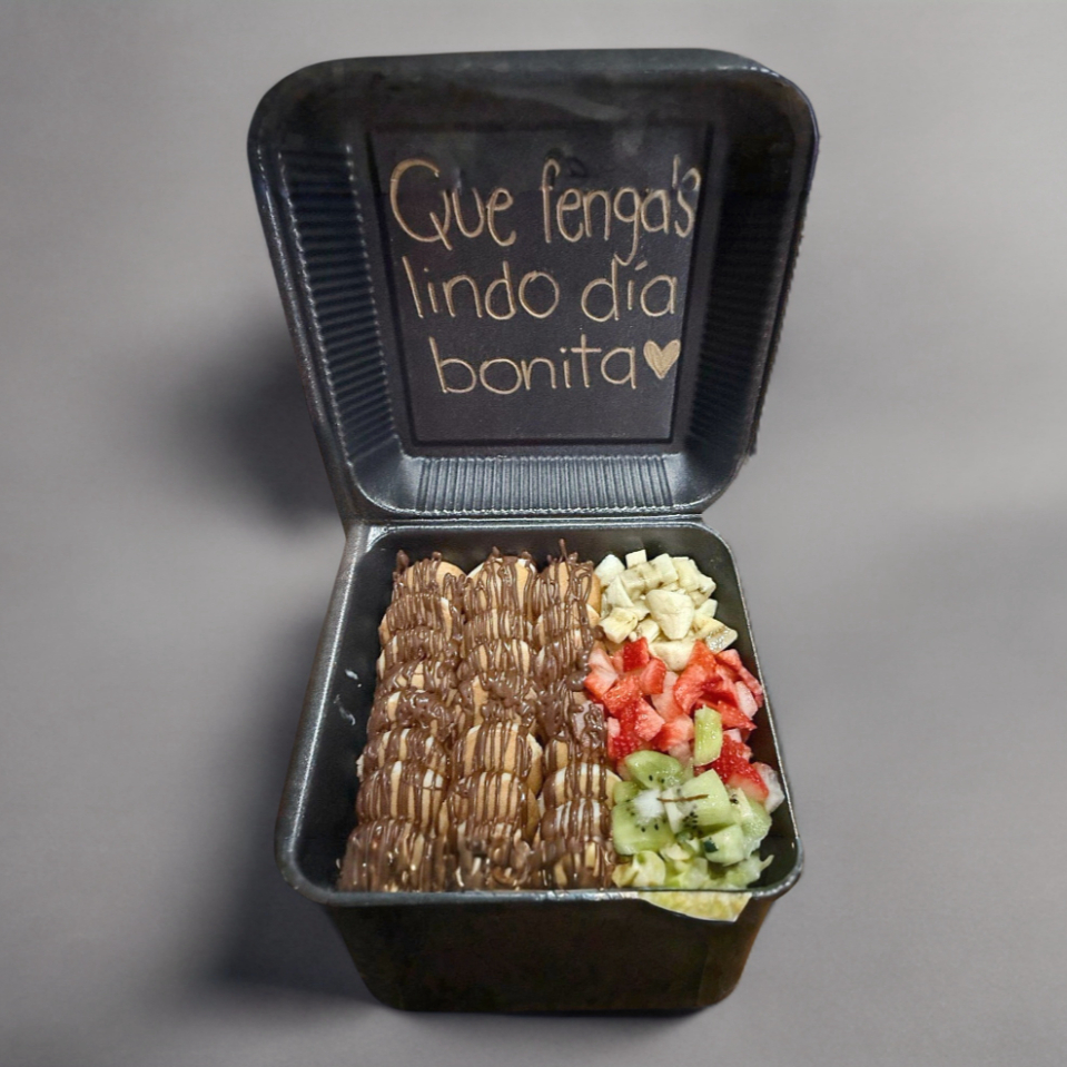 Delicioso desayuno sorpresa, puedes agregar 2 frutas y una frase emotiva