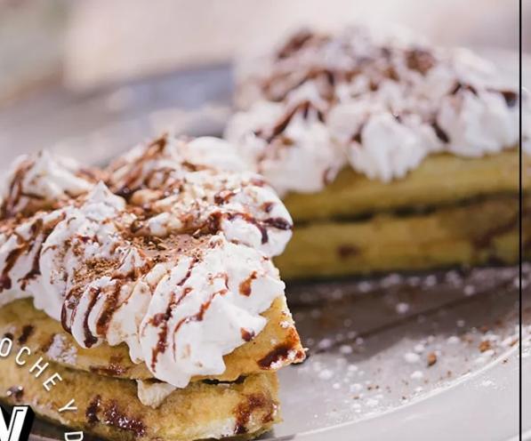 Deliciosos wafles reolvados en azúcar y canela, decorados con jarabe de chocolate Hersheys y crema batida.