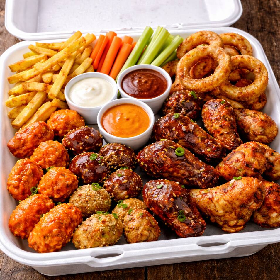 Crujientes alitas de pollo bañadas en tu salsa favorita, acompañadas de bastones de apio, zanahoria y dip ranch. La porción perfecta para el antojo. 🔥🍗