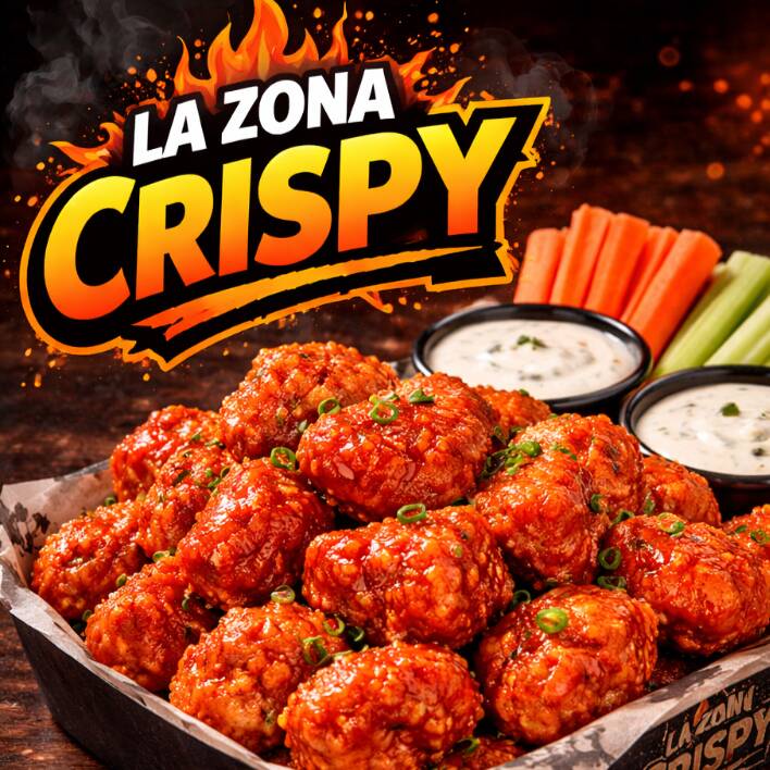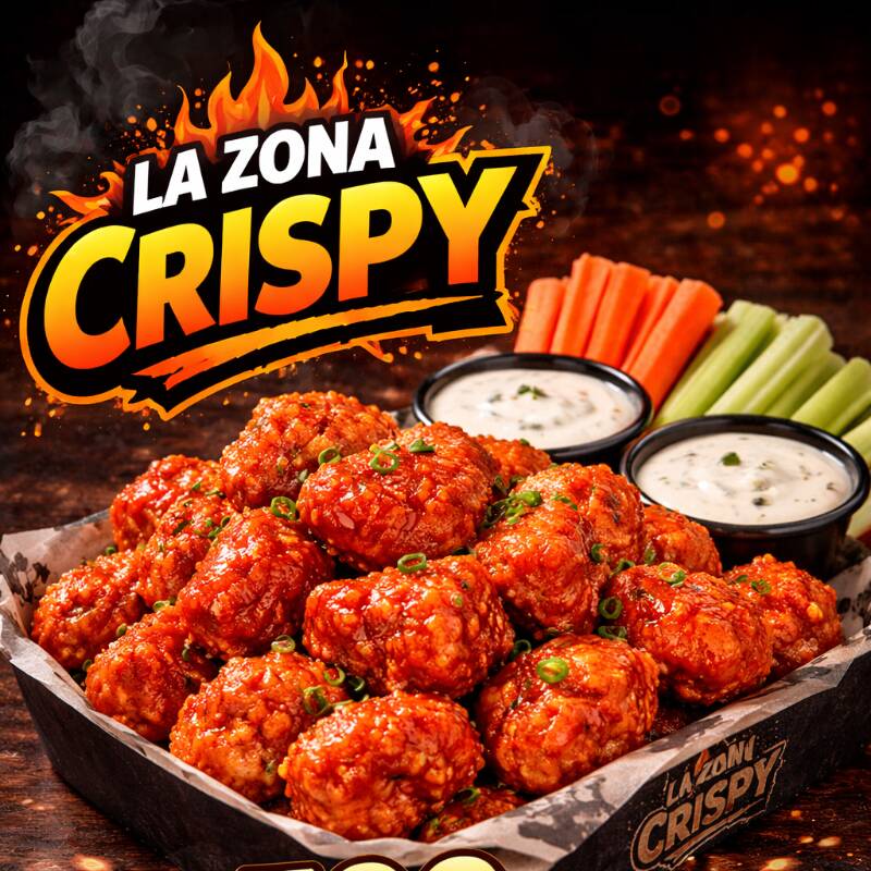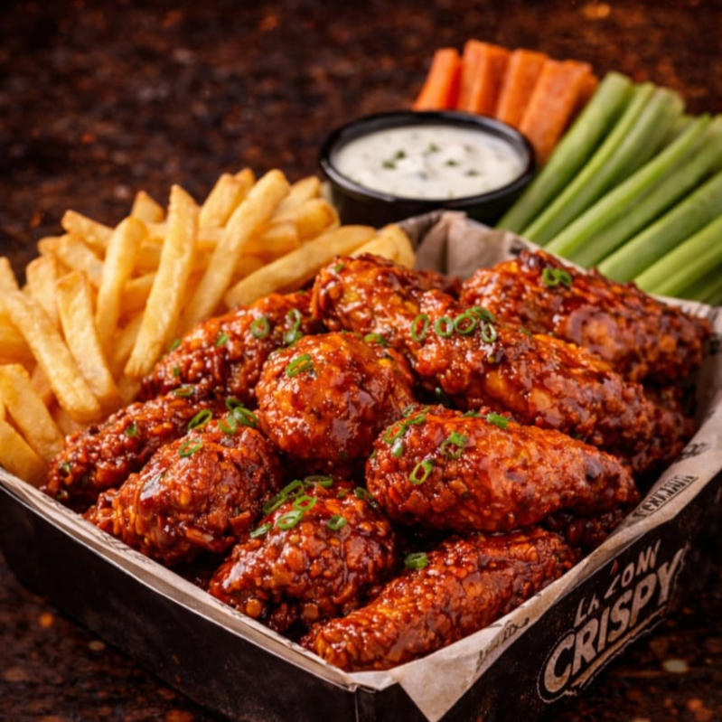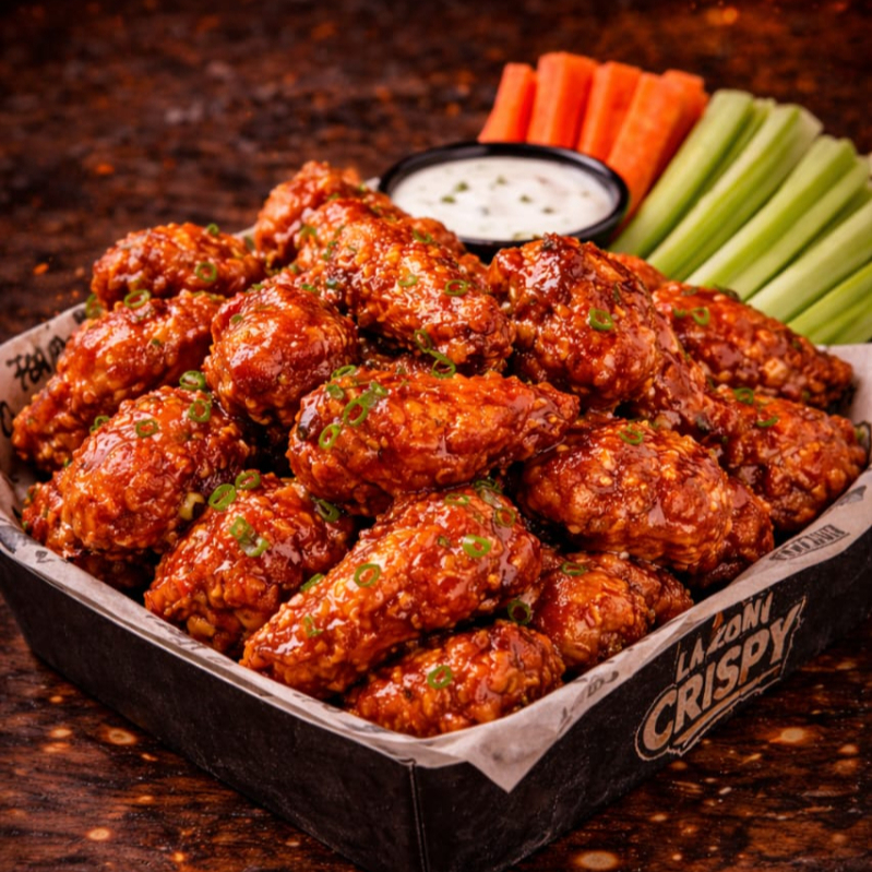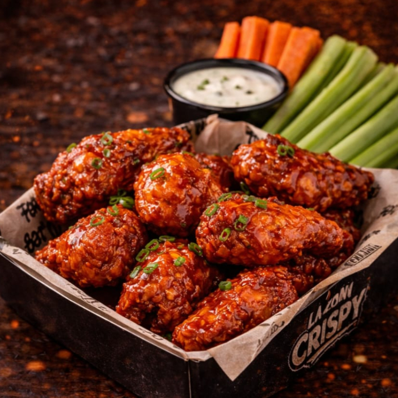 Crujientes alitas de pollo bañadas en tu salsa favorita, acompañadas de bastones de apio, zanahoria y ranch. La porción perfecta para el antojo. 🔥🍗