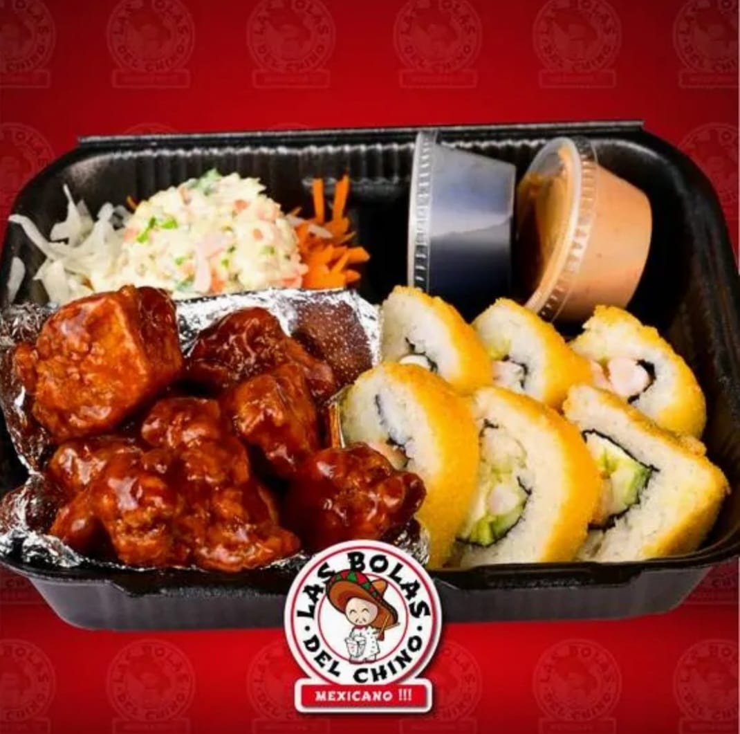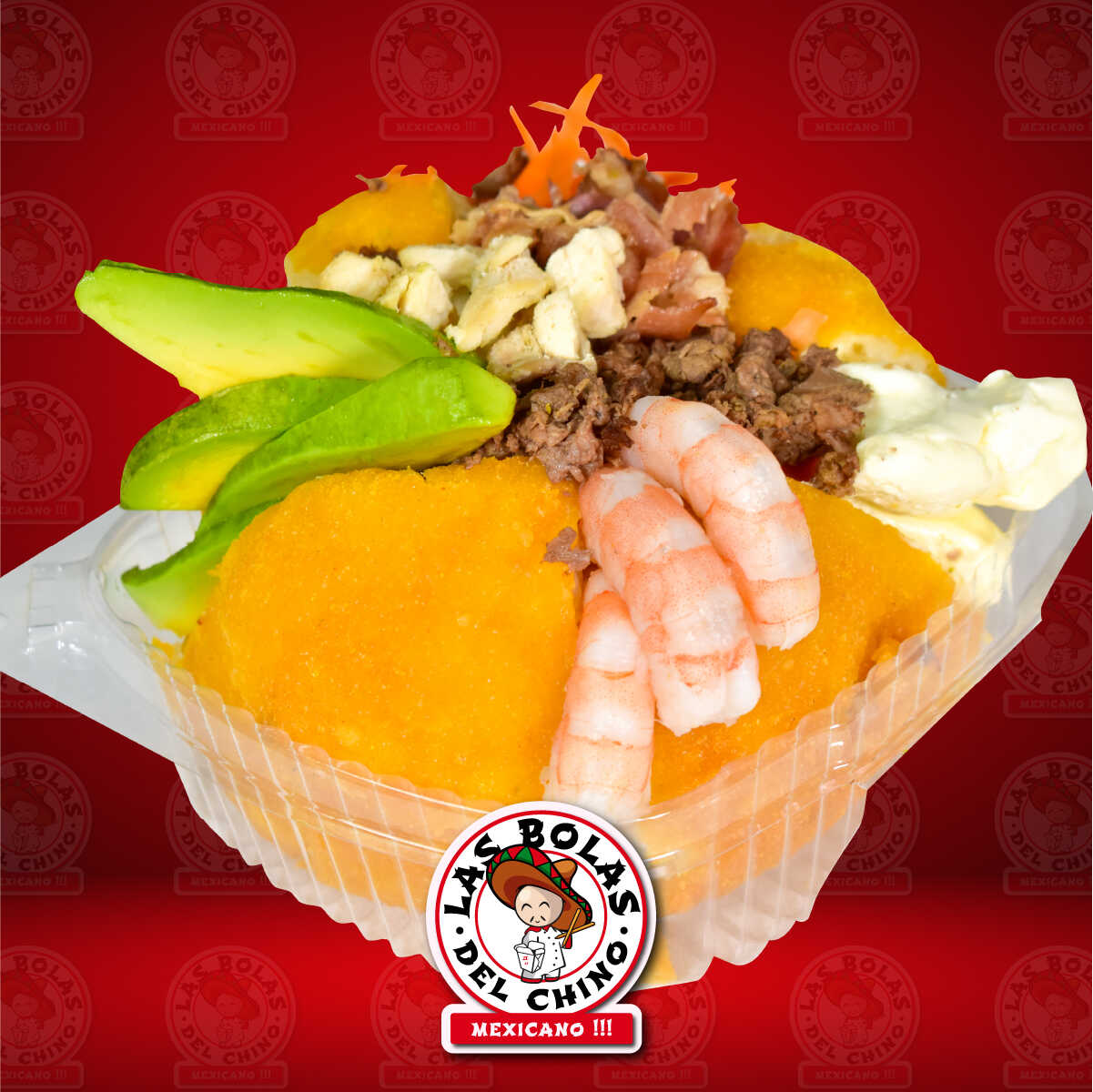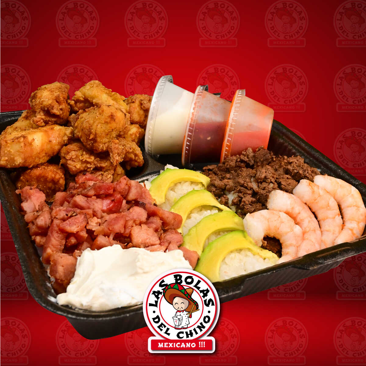 Bola de arroz empanizada con aguacate, queso philadelphia, jícama, zanahoria, cuatro proteínas (camarón, res, tocino y pollo) y dos salsas a elegir.