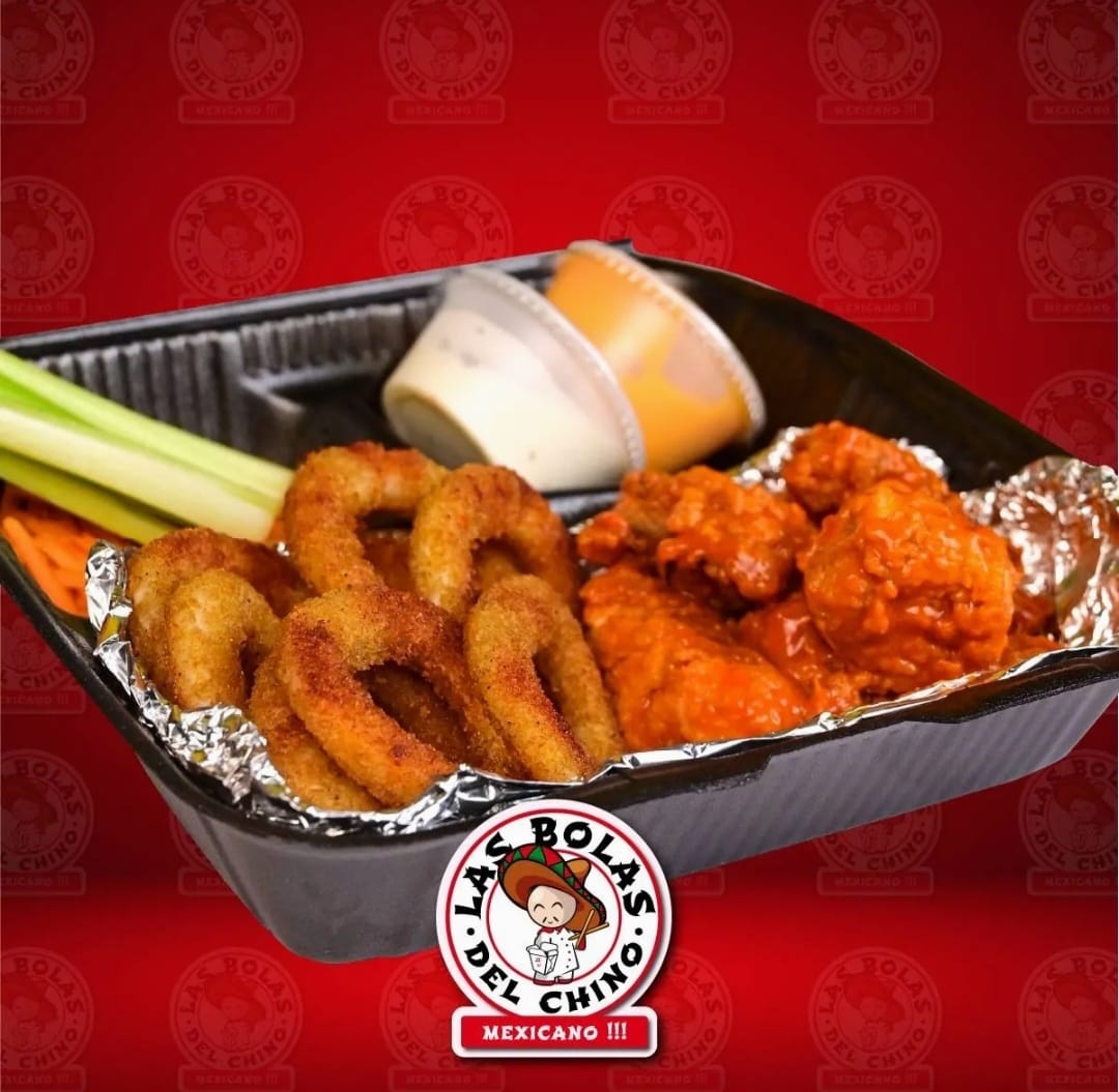 Media orden de Boneless, acompañados de media orden de complemento a elegir, entre aros de cebolla y papas en gajo, 2 salsas (chipotle y Anguila)