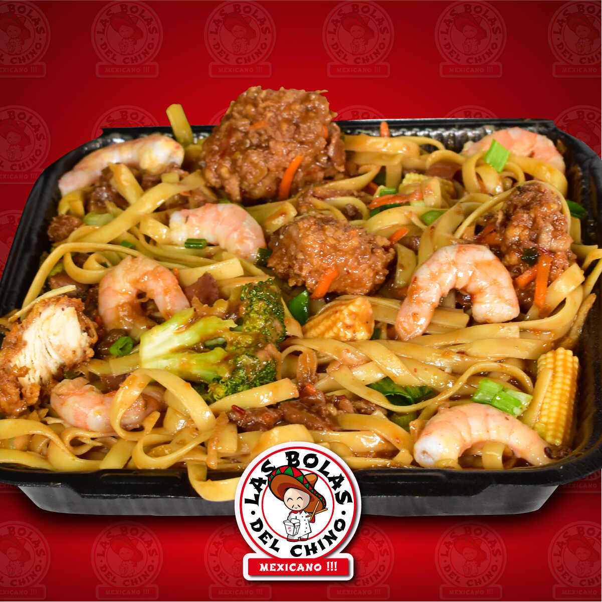 Fideo grueso o arroz, jícama, zanahoria, brócoli, elotitos y cuatro proteínas (camarón, res, tocino y boneless). pídelo con salsa teriyaki, secreta o combinada.