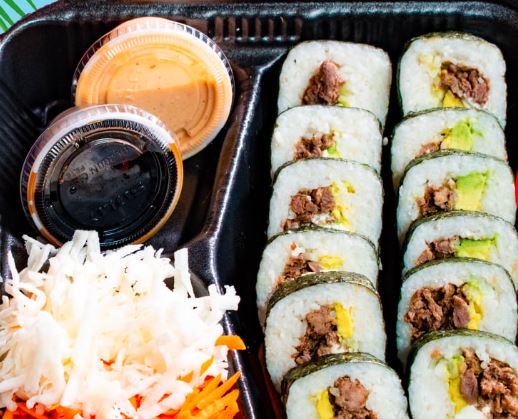 Rollo cubierto de alga con una proteína a elegir, aguacate, queso philadelphia, alga, jícama, zanahoria y dos salsas a elegir.