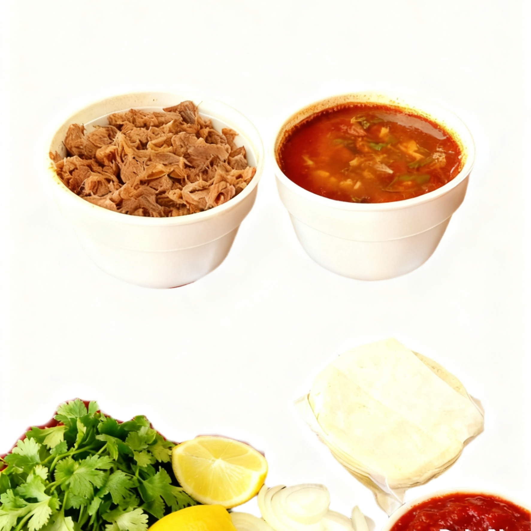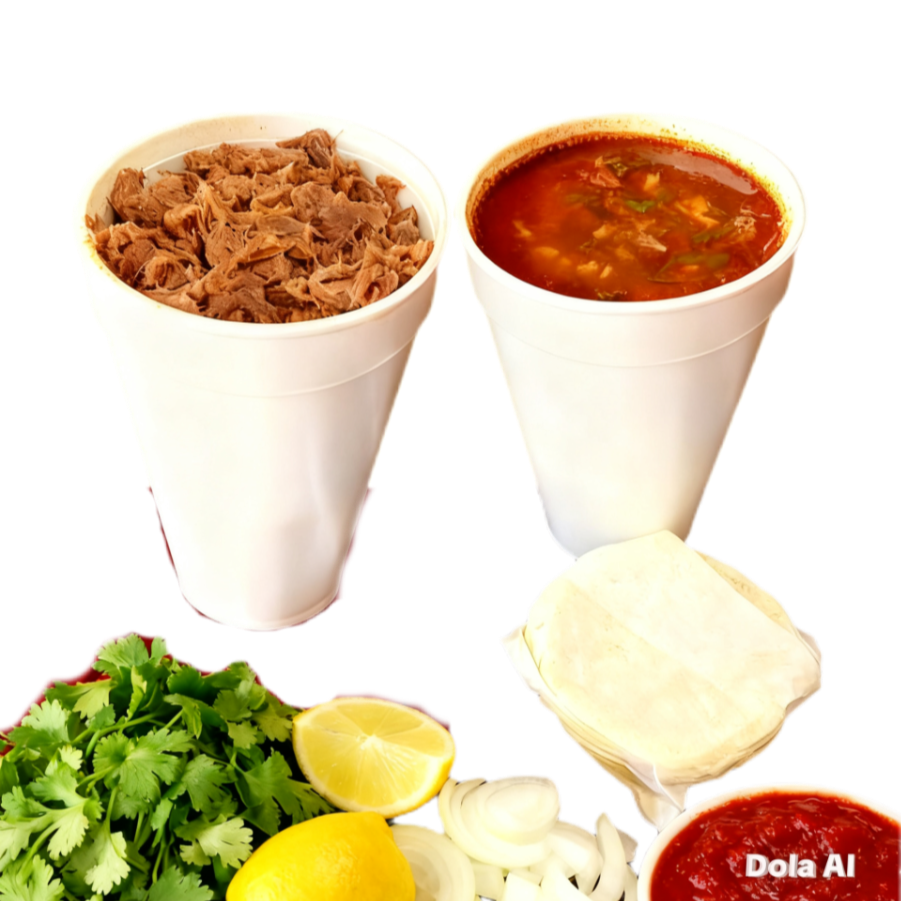 CONSOME DE UN LITRO CON PORCION DE CARNE 8TORTILLAS DE MAIZ CILANTRO, CEBOLLA, REPOLLO, LIMON Y SALSA ROJA VAN POR SEPARADO PARA PREPARAR AL GUSTO
