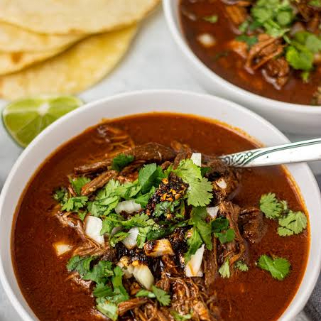 CONSOME DE MEDIO LITRO CON PORCION DE CARNE DE BIRRIA 6 TORTILLAS DE MAIZ CILANTRO, CEBOLLA, REPOLLO, LIMON Y SALSA LAS VERDURAS BIENEN POR SEPARADO PARA PREPARAR AL GUSTO