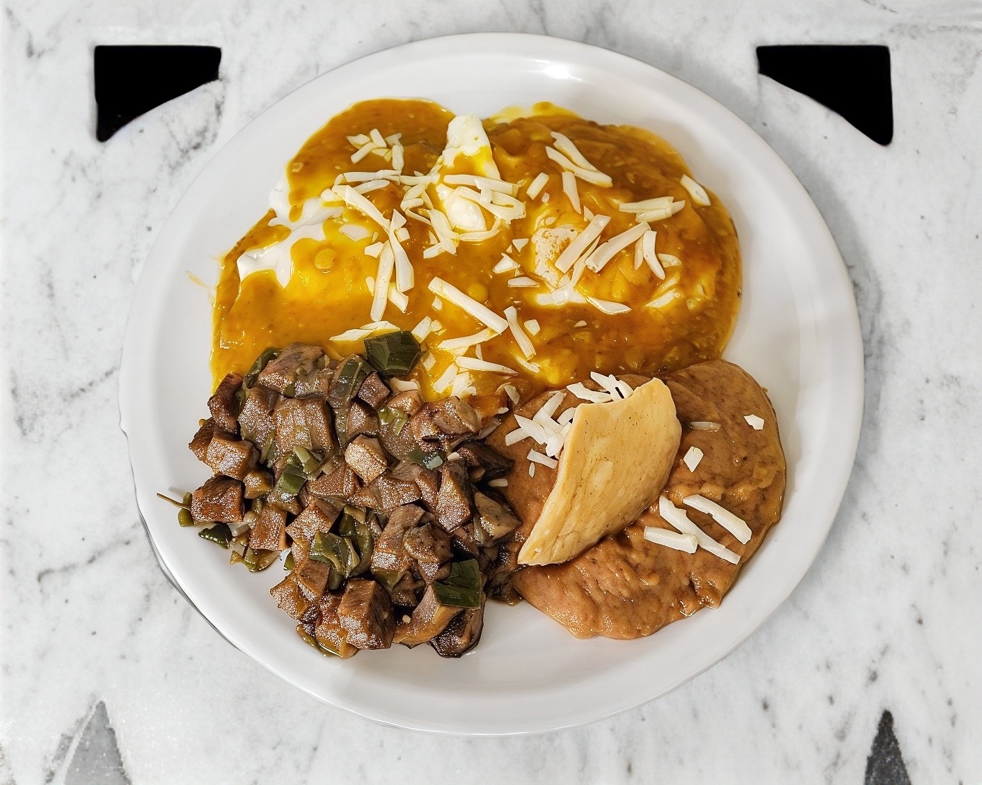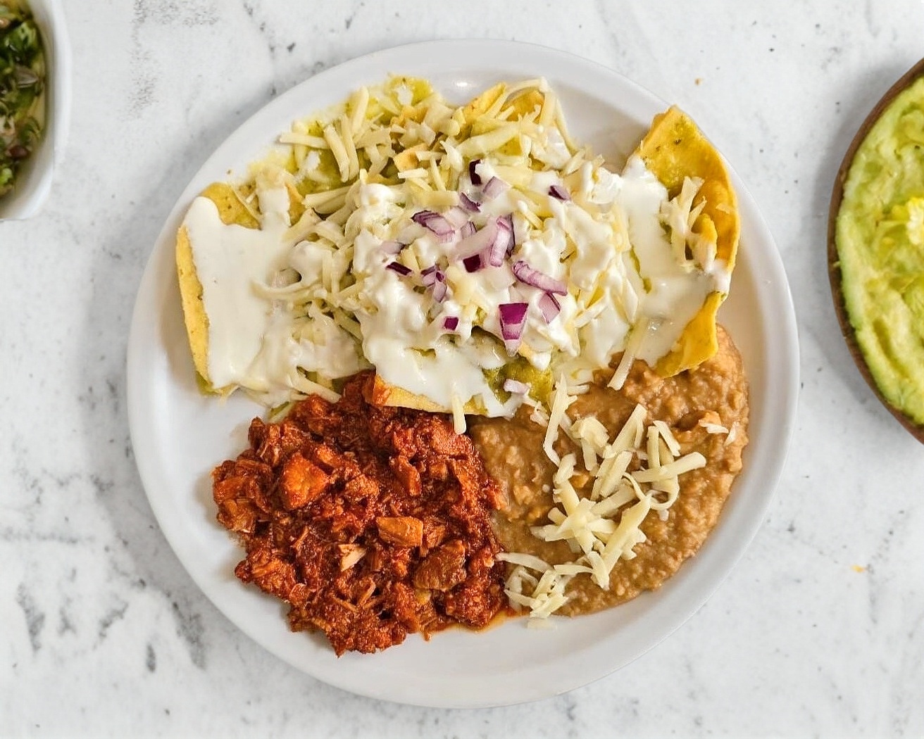 Tortilla de maíz dorada, sumergida en salsa verde o roja casera, servida con queso fresco desmoronado, crema y cebolla blanca. Acompañada de un guiso a tu elección y frijoles tradicionales para una persona