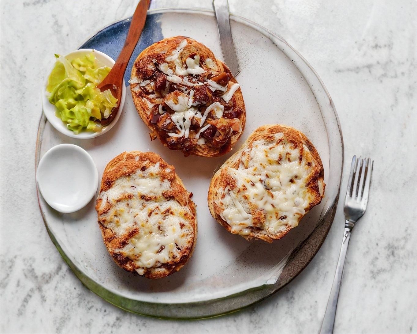 Dos molletes con frijoles y queso montados con un guisado a elegir.