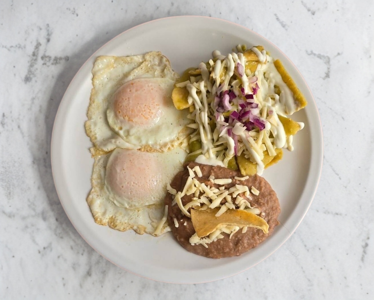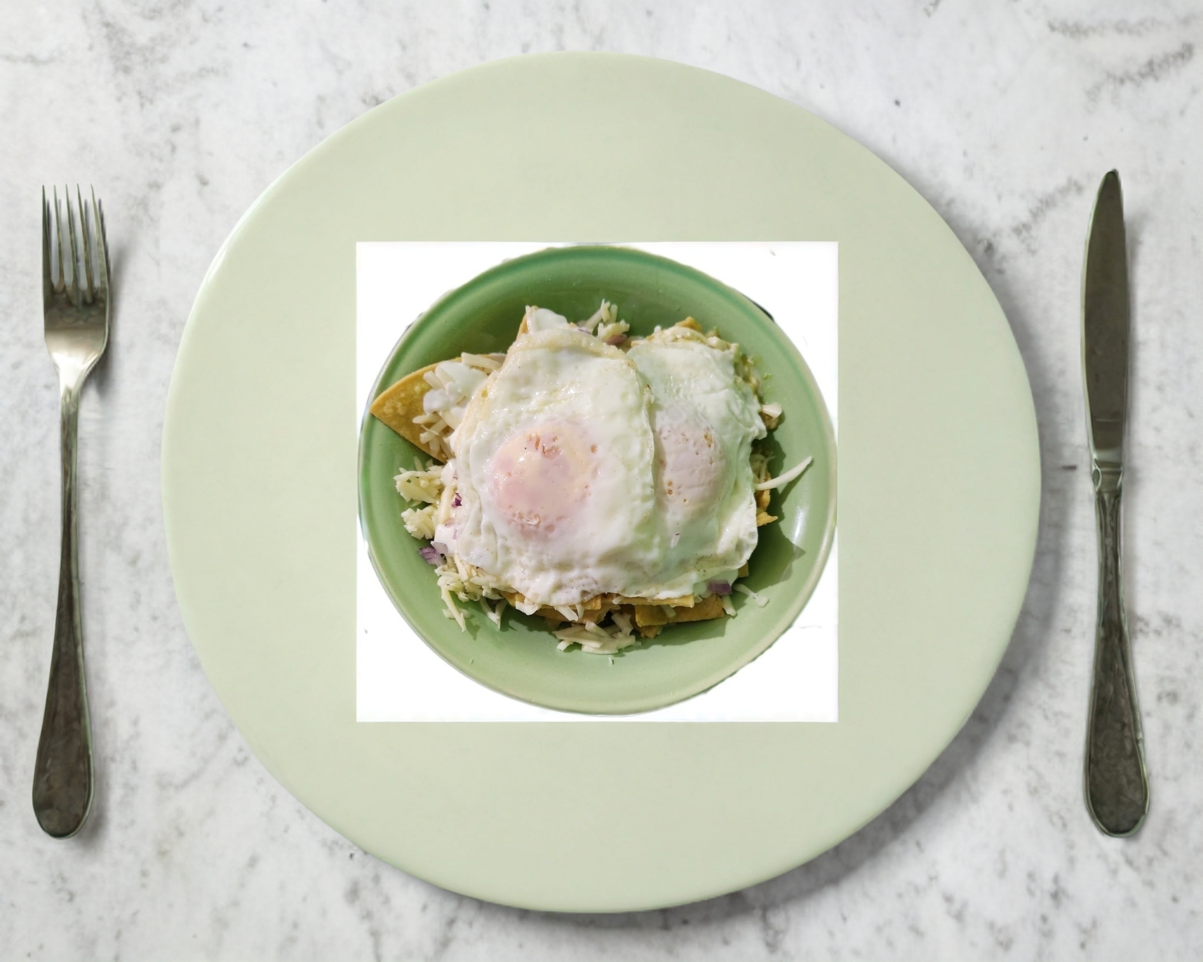 Totopos de maíz bañados en su salsa de preferencia, acompañados de queso,crema y cebolla montados con dos huevos.