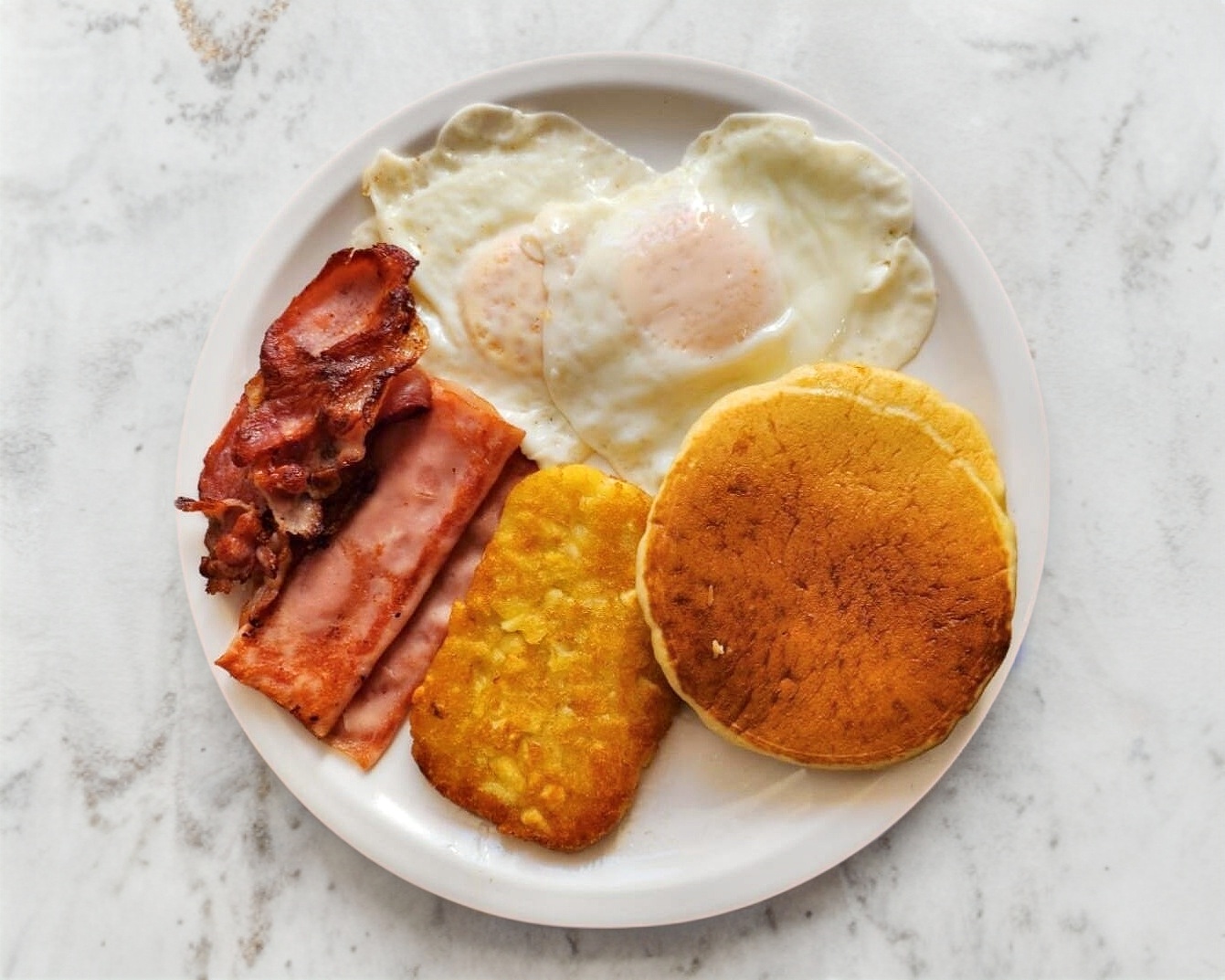 2 huevos acompañados de una papa hash brown , 2 tiras de tocino, 2 sausages, 2 piezas de jamon y 2 piezas de hot cakes pequeños