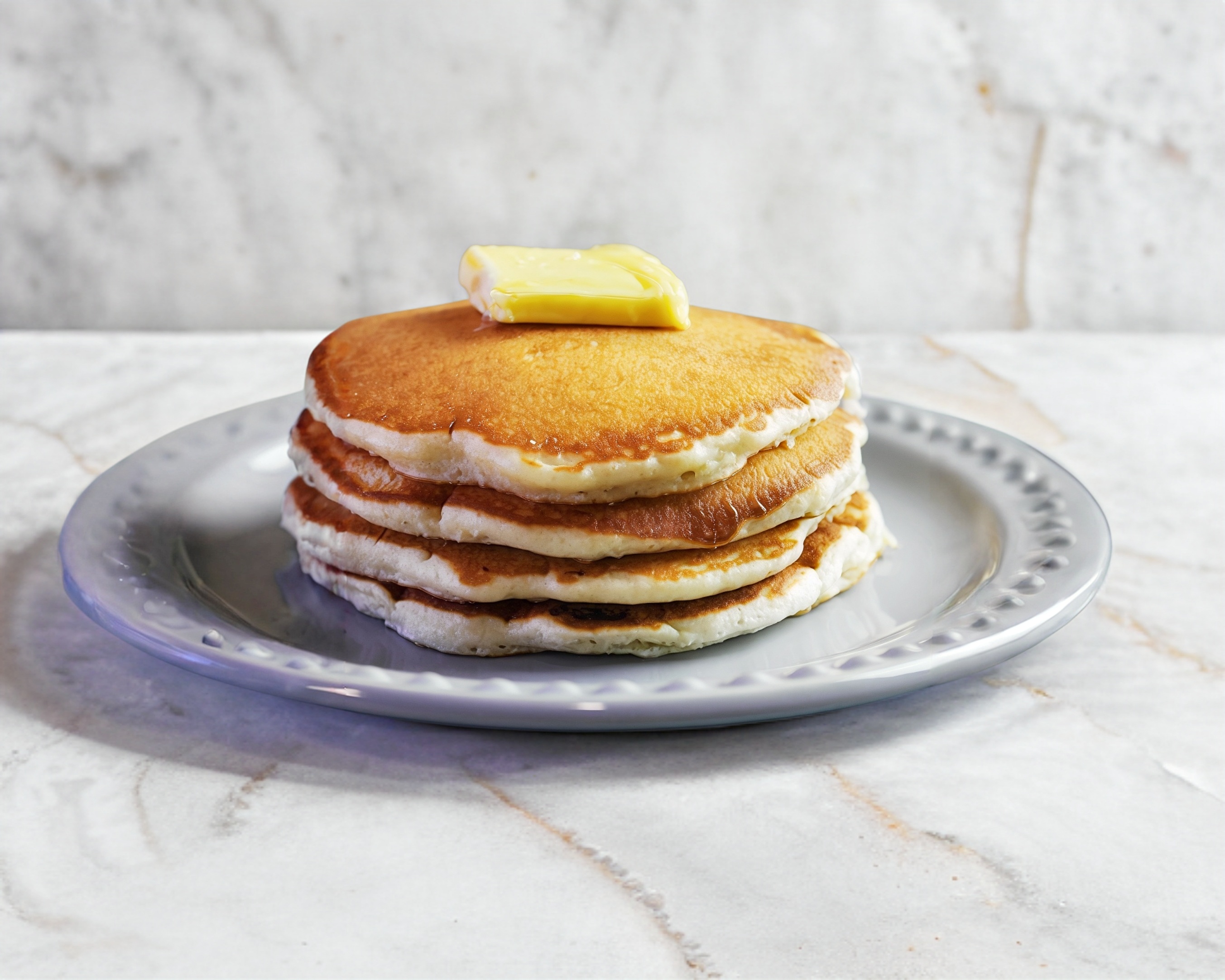 Tres piezas de Hot Cakes acompañados de miel de maple y mantequilla mas dos huevos estrellados o revueltos