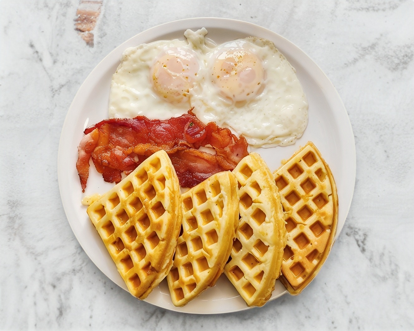 Waffle (miel y mantequilla) + dos huevos al gusto + tocino