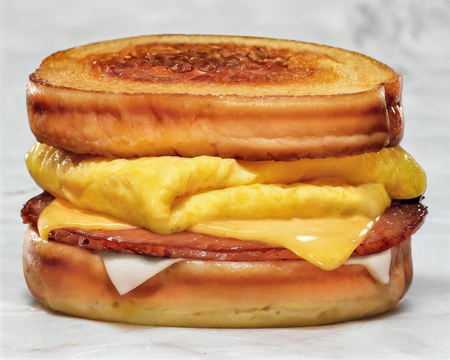 Pan briche relleno con salchichas de desayuno, tocino, queso americano, queso chihuahua, jamón, mayonesa y huevo. Acompañado de papas fritas.
