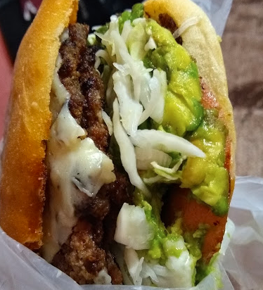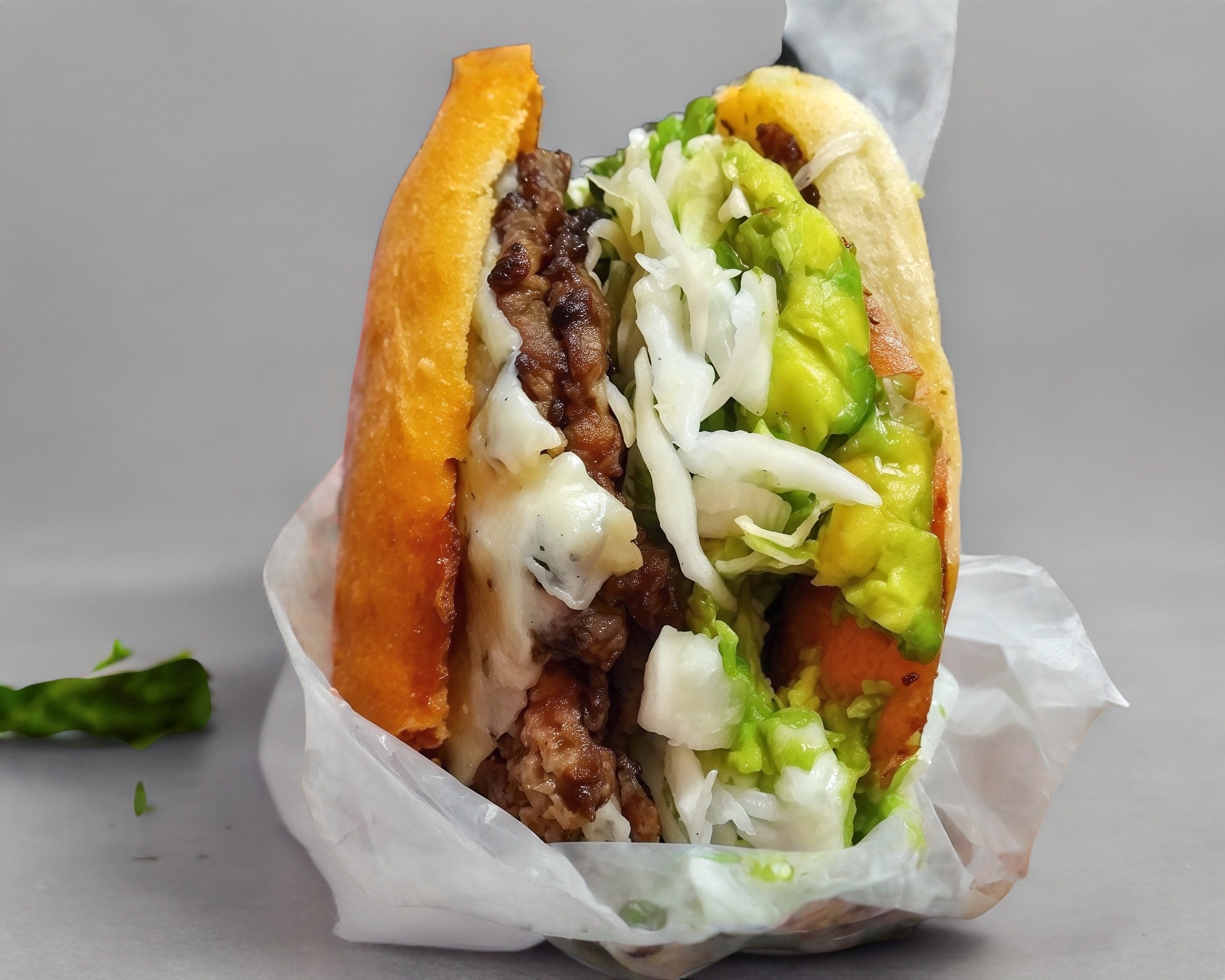 Carne, queso, aguacate, verdura, mayonesa y mostaza.