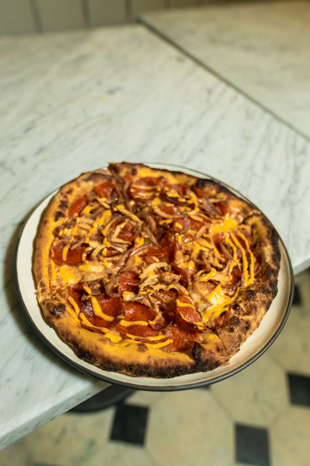 Full pepperoni, salsa de tomate, aioli de Siracha y cebolla firta