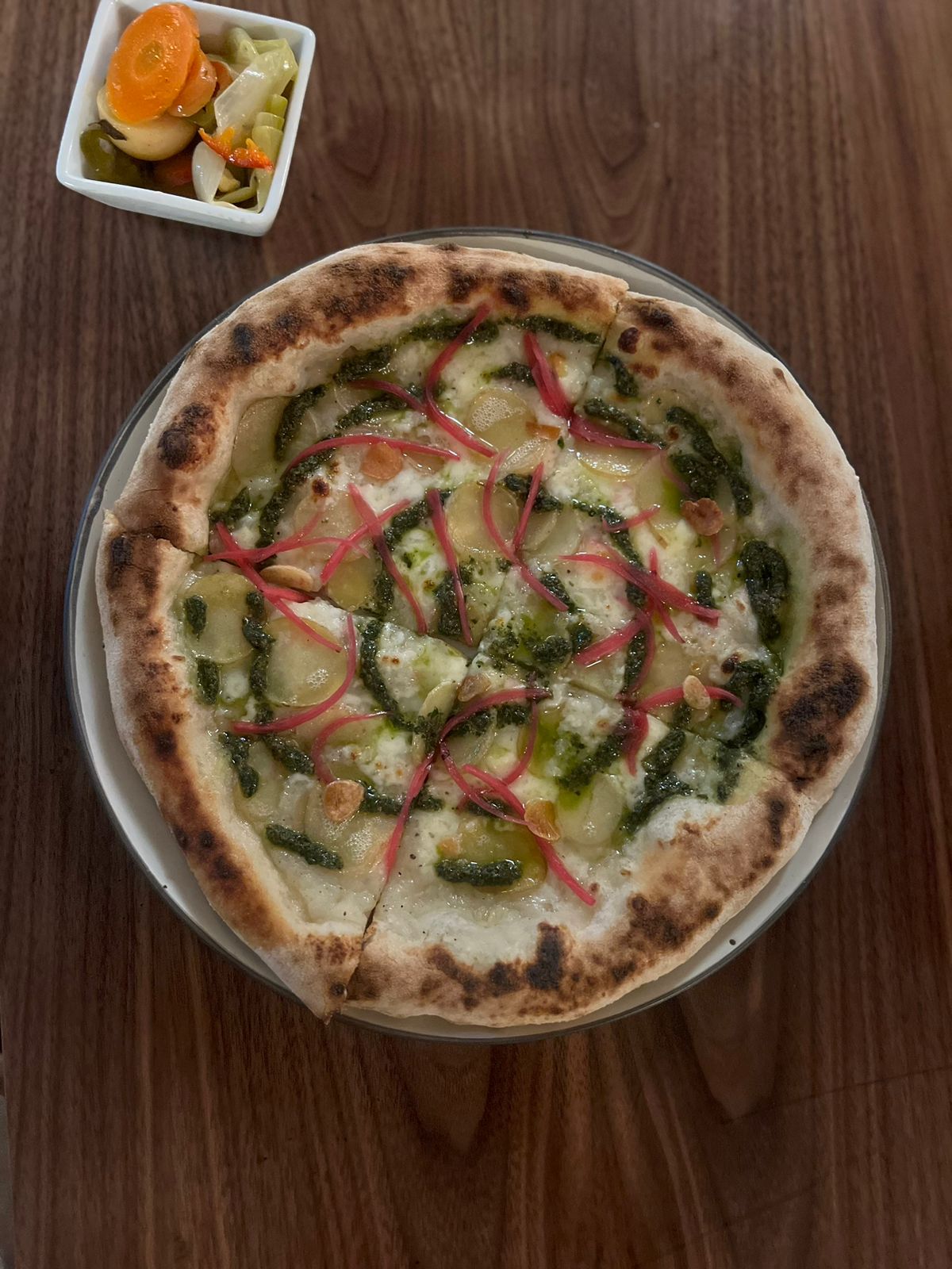 papa cambray, pesto de nuez , fondue de papa, chips de ajo, y cebollo curtida