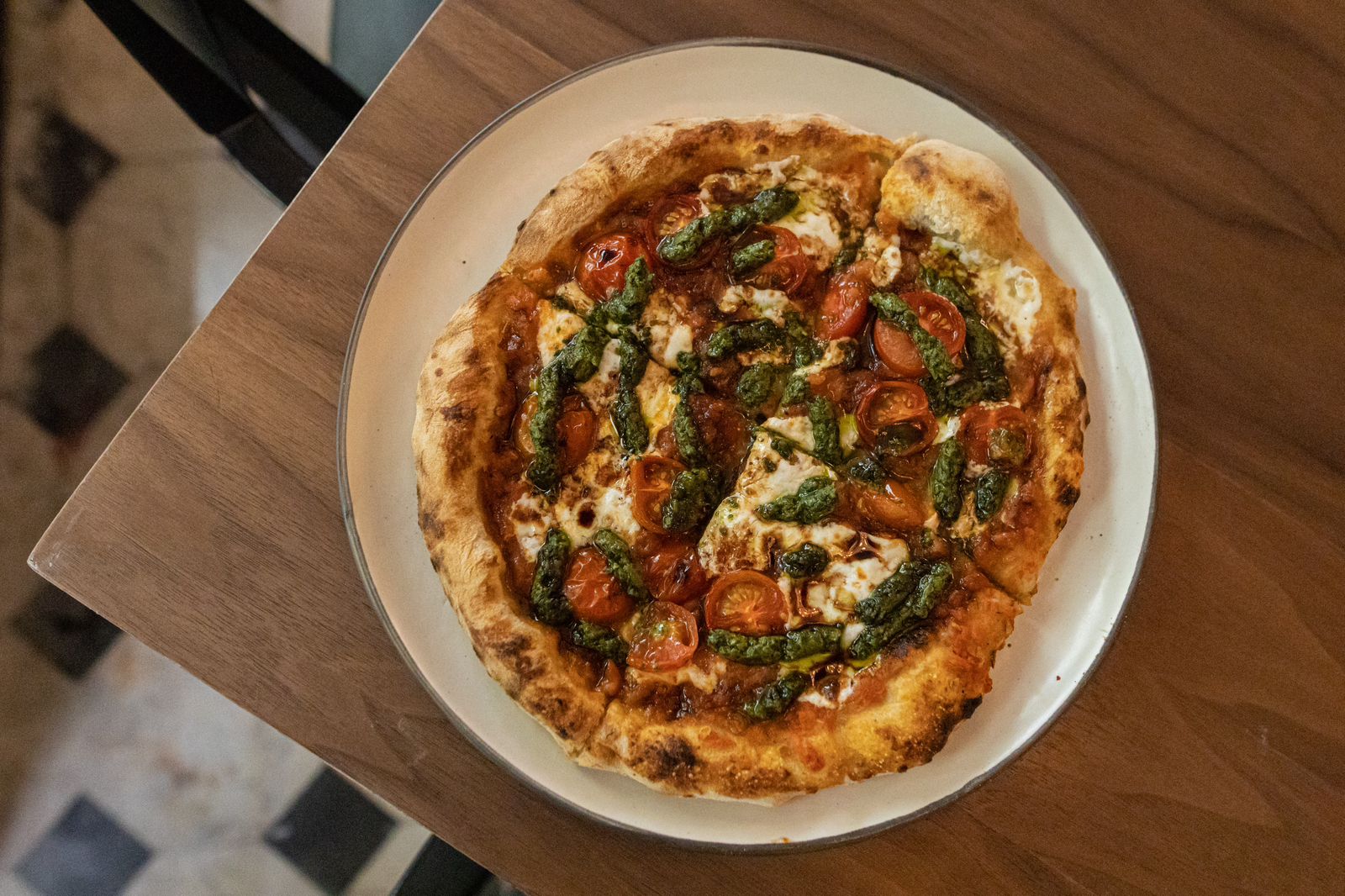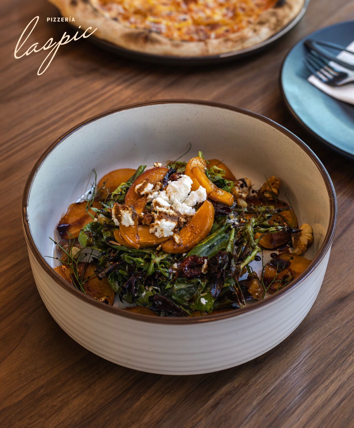 Tomate deshidratado y cherry, pesto de nuez, salsa de tomate, mozarella y redución de balsámico