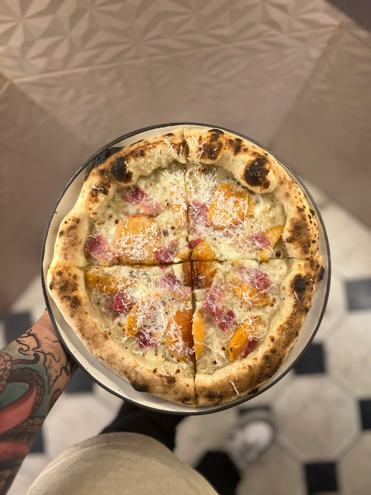 tocino, pure de piña ahumada, salsa de tomate, mozarella y cebolla caramelizada