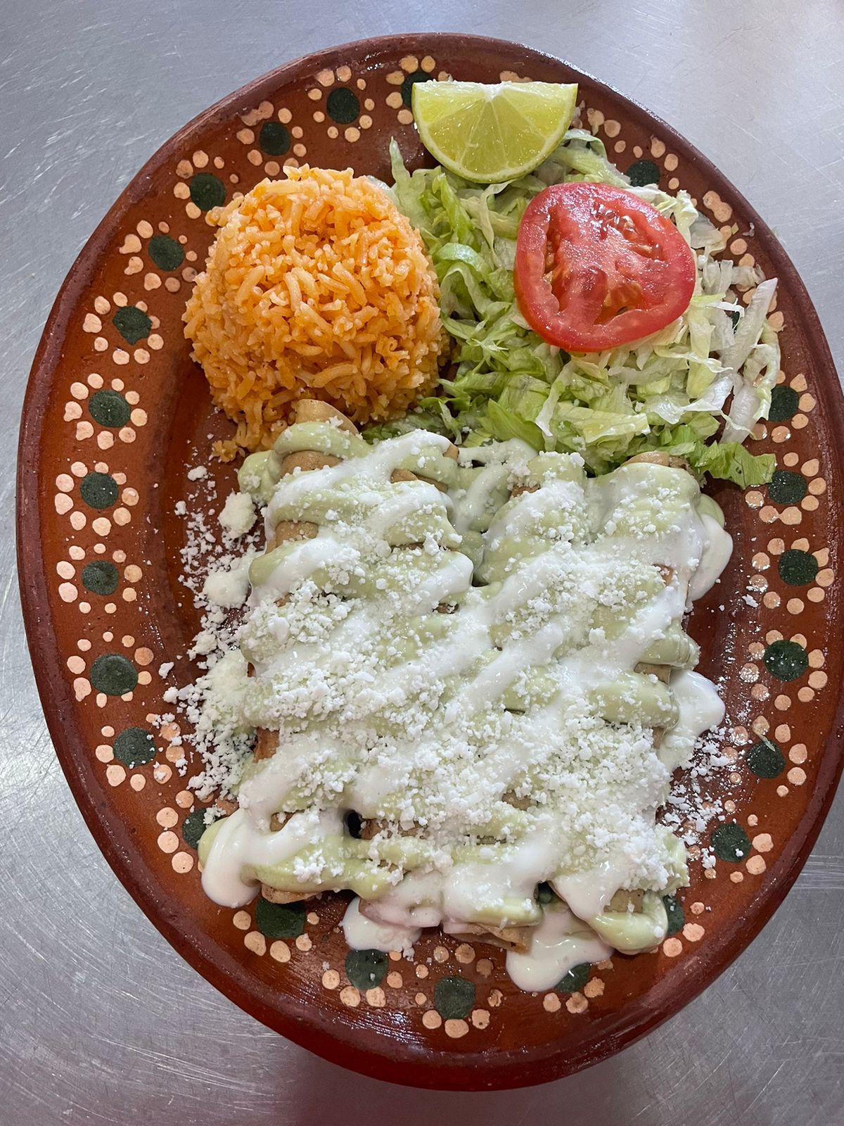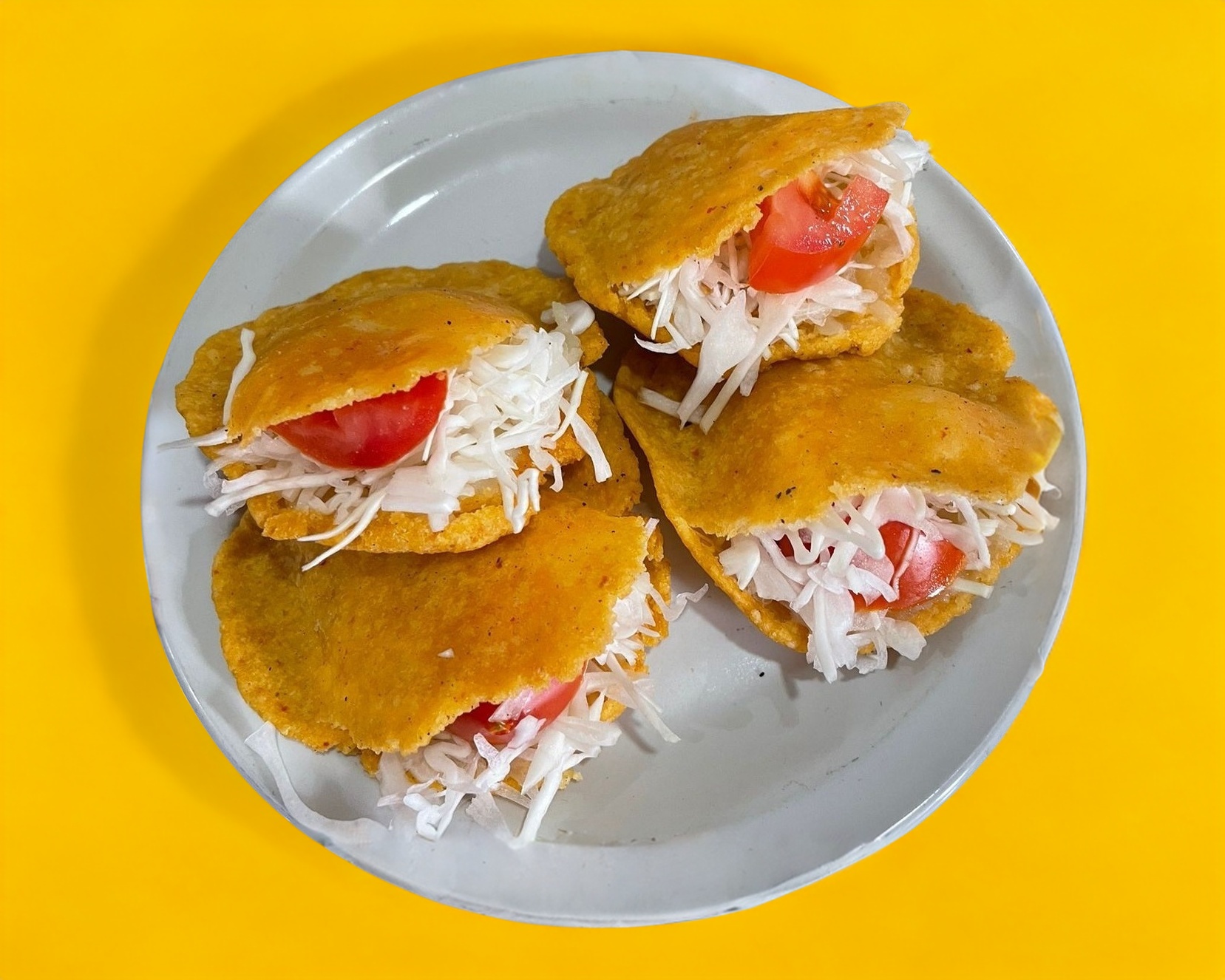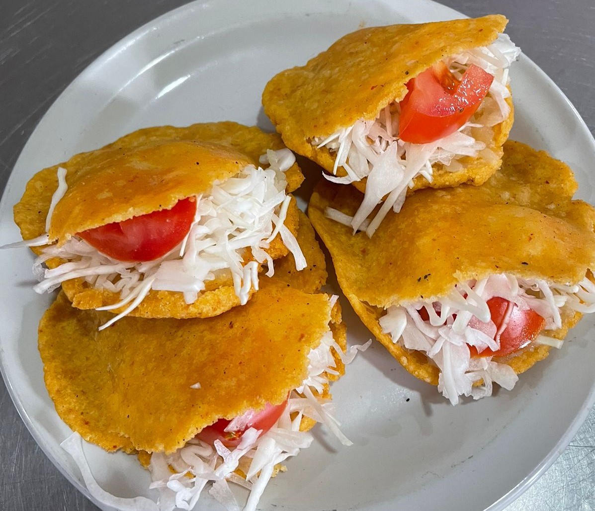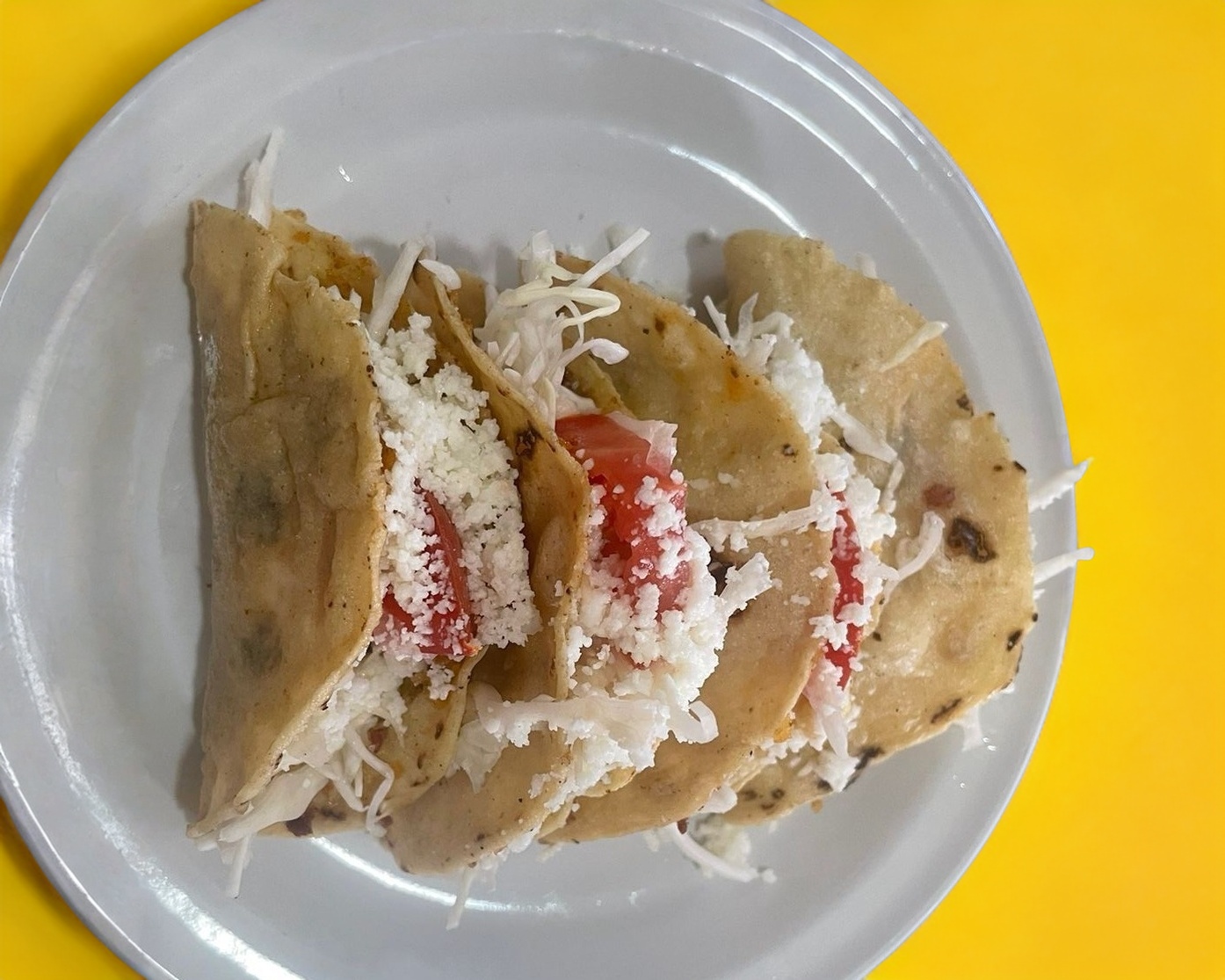 Taquitos rellenos de papa con carme molida, repollo, tomate y queso fresco.