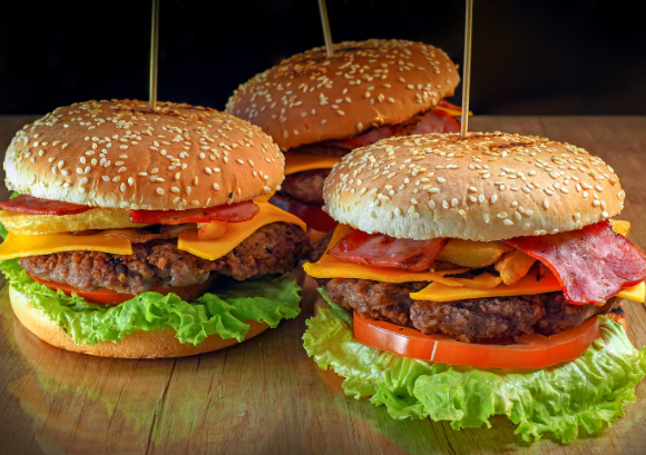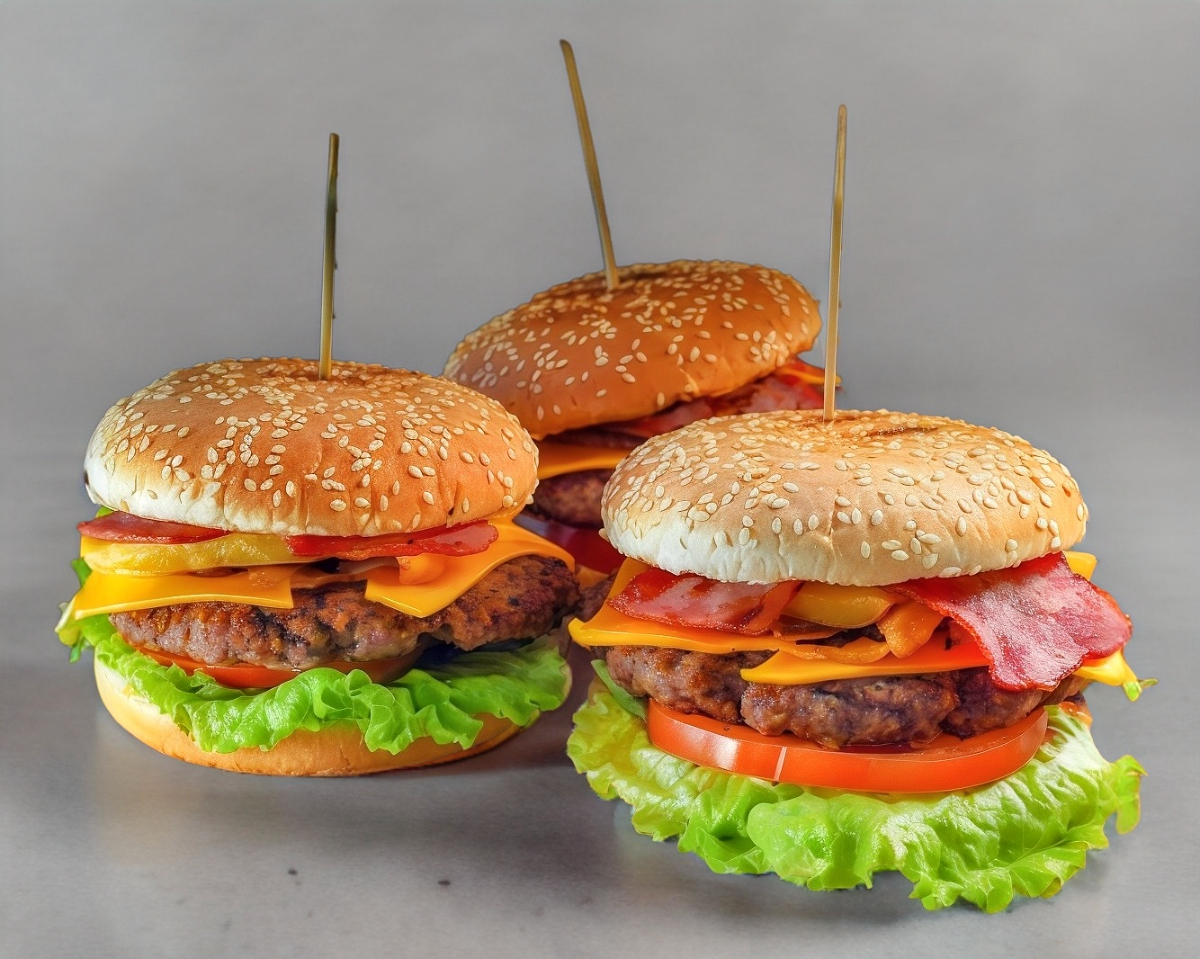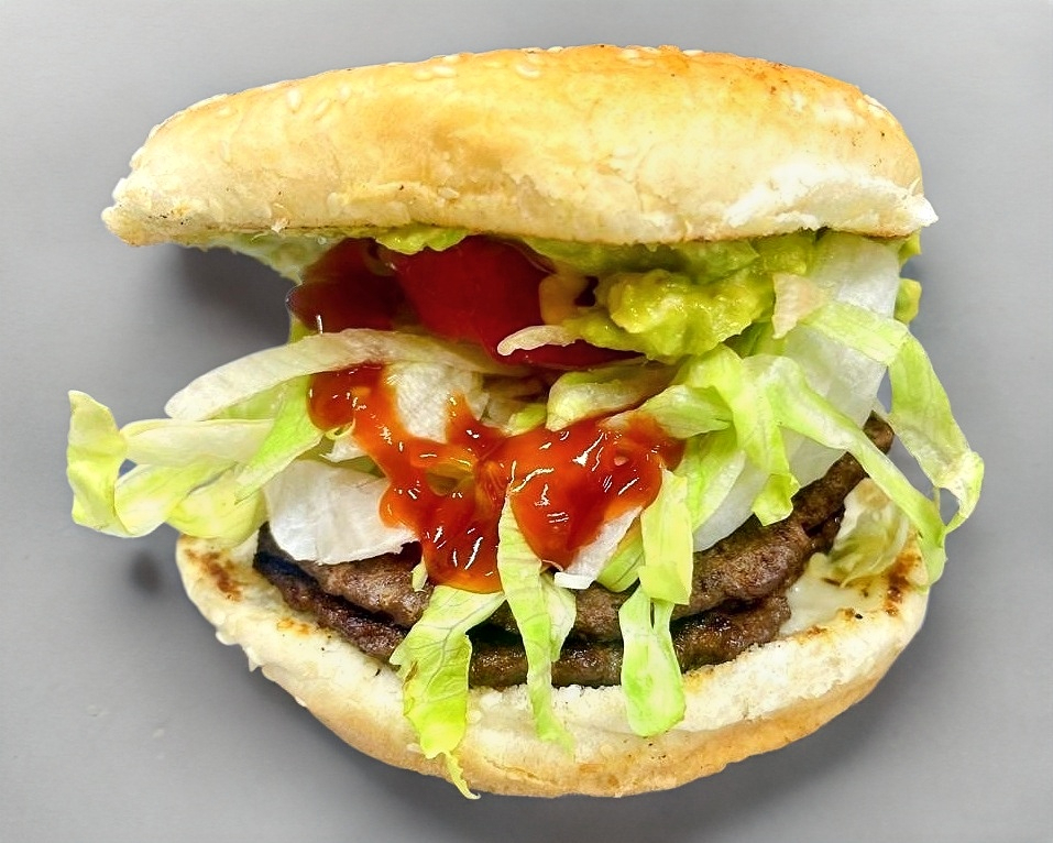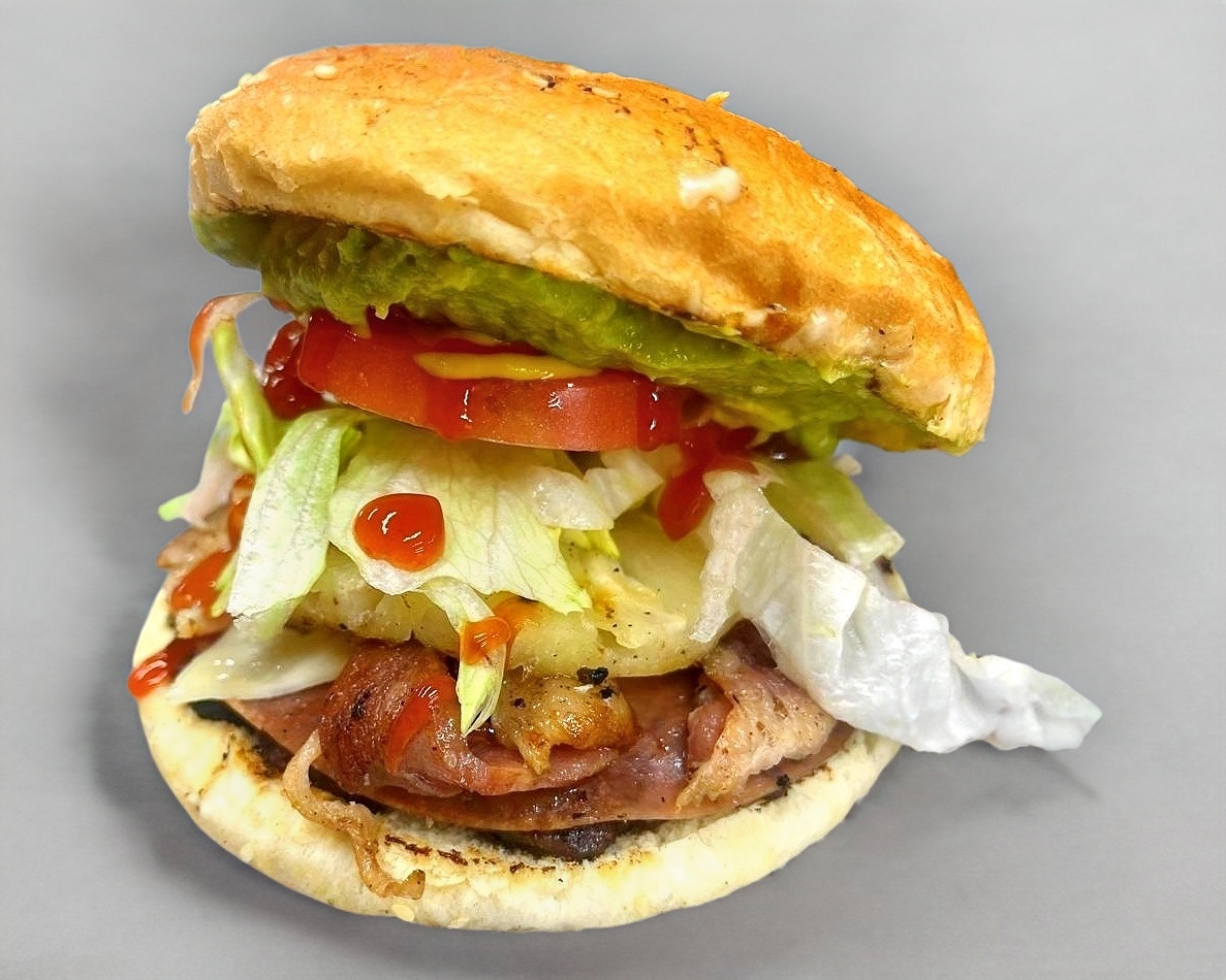 Carne, queso, jamón, tocino, verdura y aguacate.