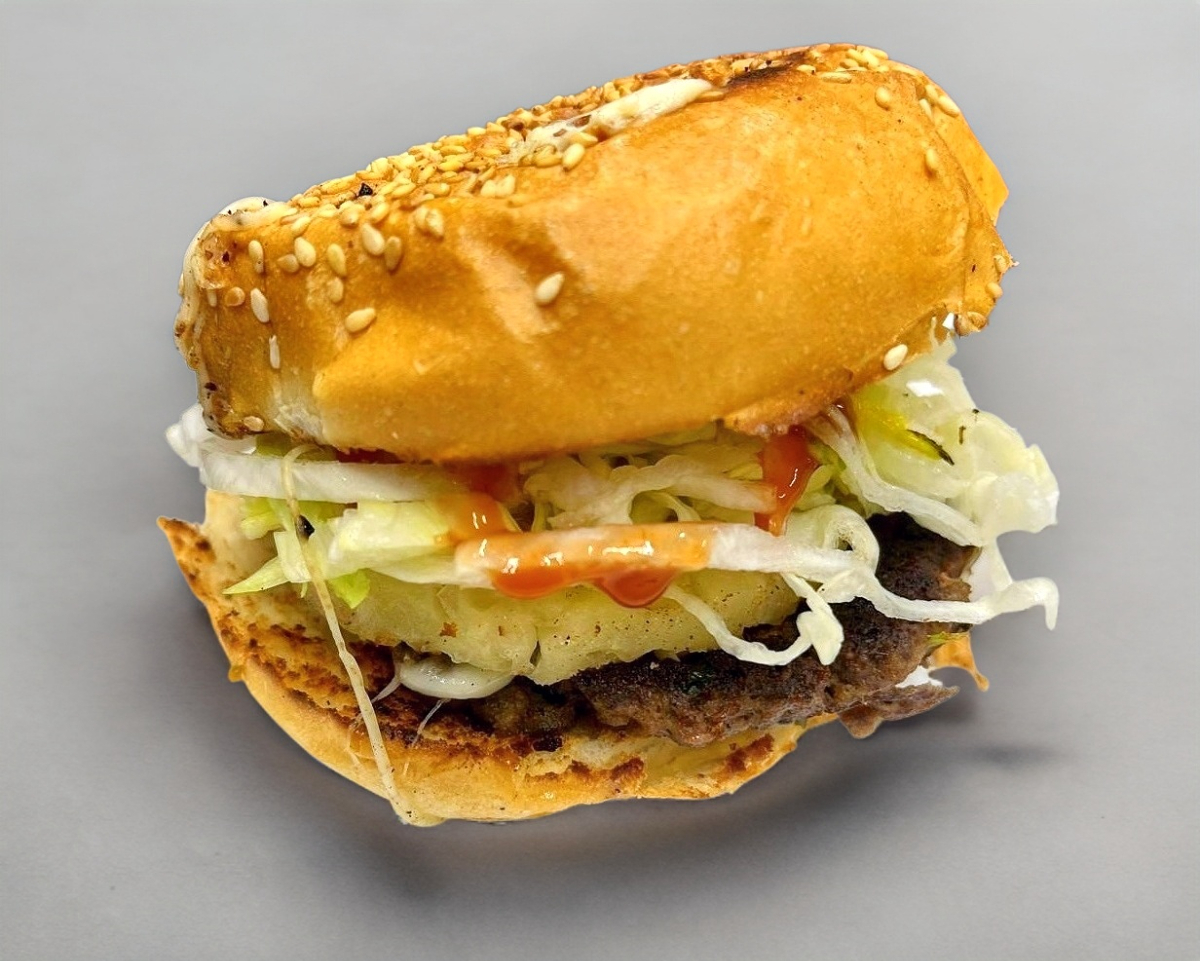Carne, queso, jamón, tocino, piña, verdura y aguacate.