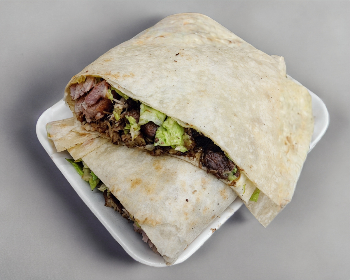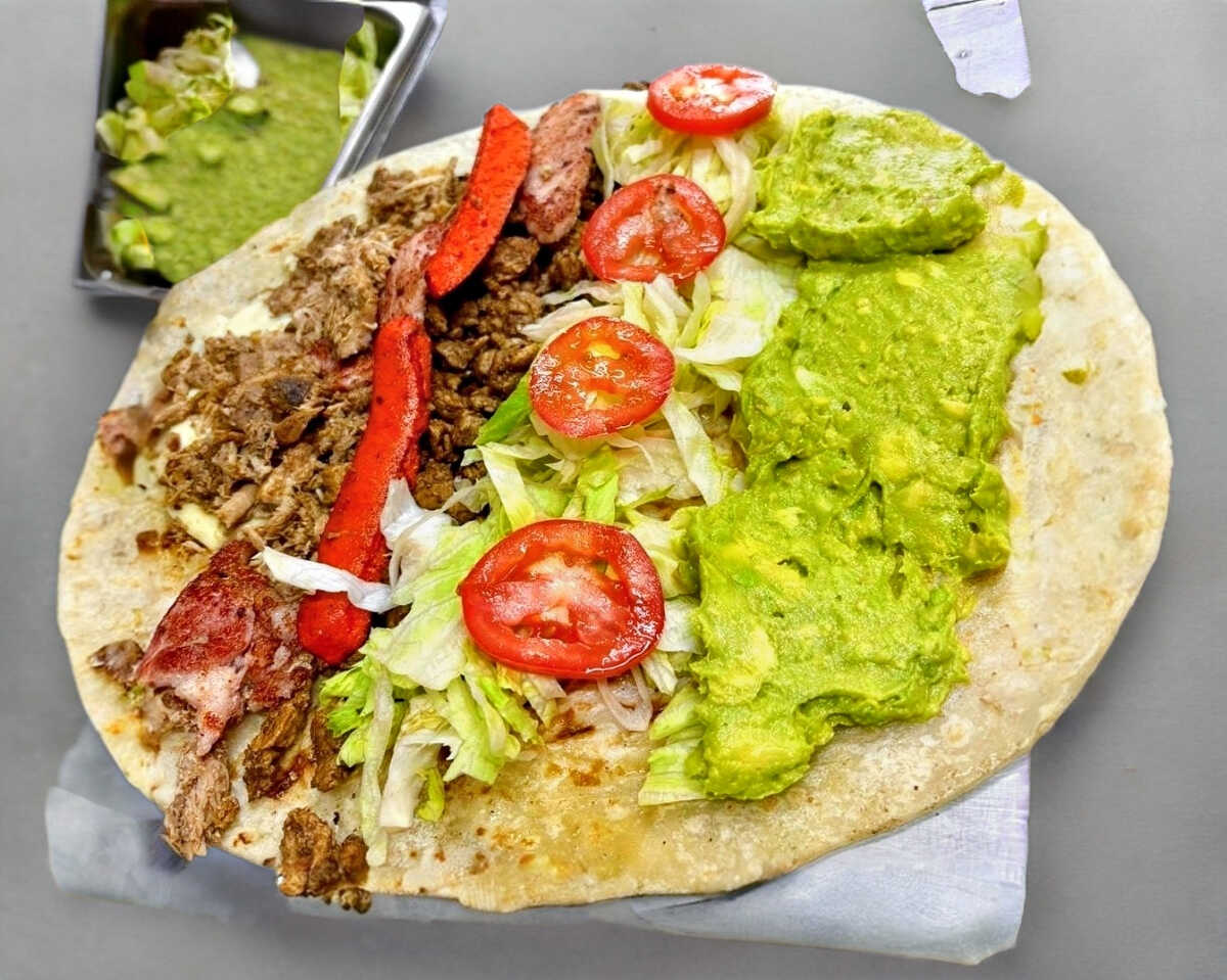 Carne asada, jamón, queso, tocino, verdura y aguacate.