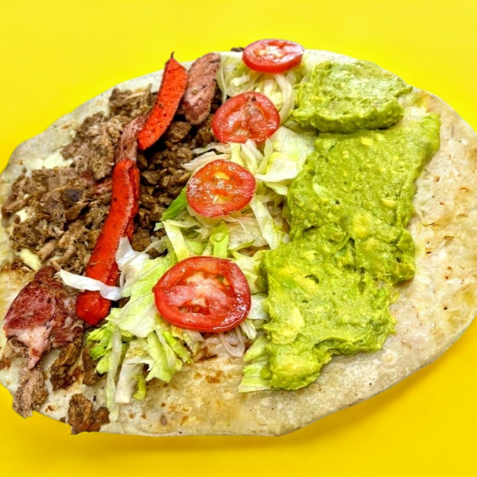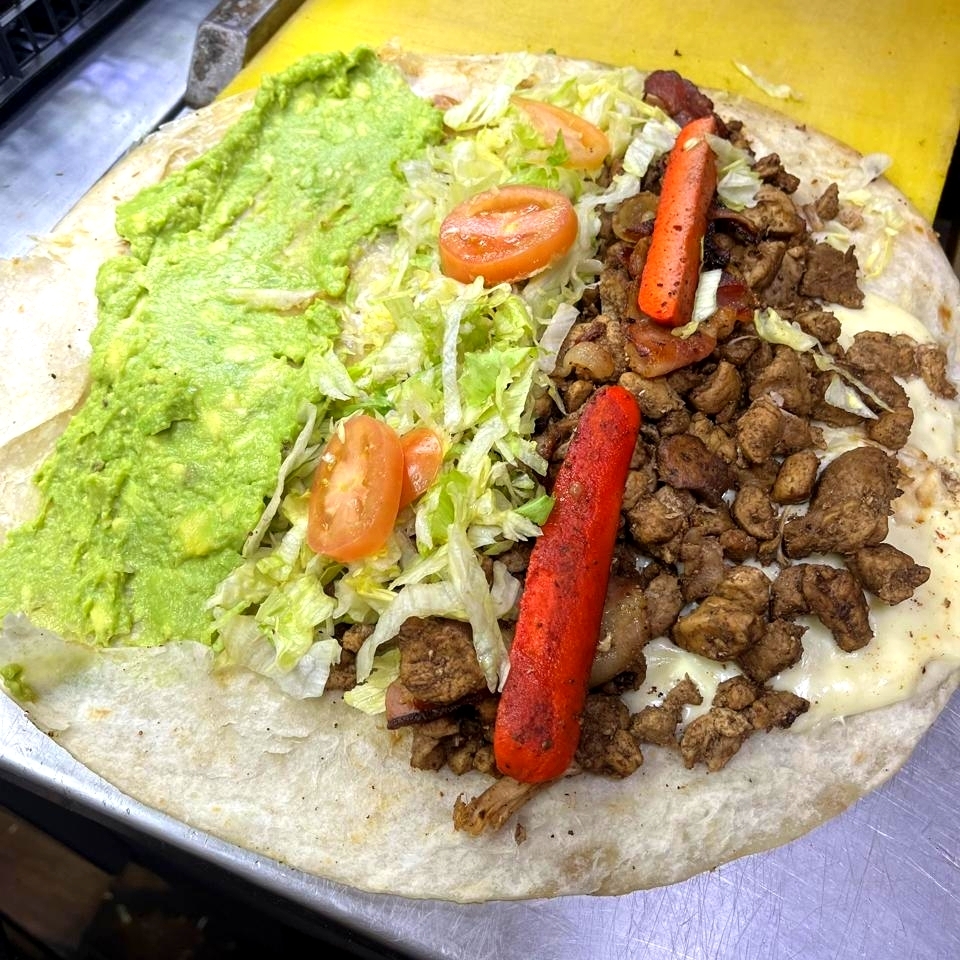 Tortilla gigante, Asadero completo, Carne Asada, Tocino, salchicha Asada, Lechuga, Tomate, Aguacate