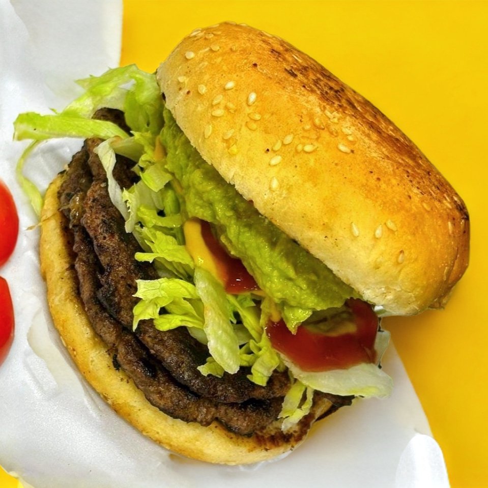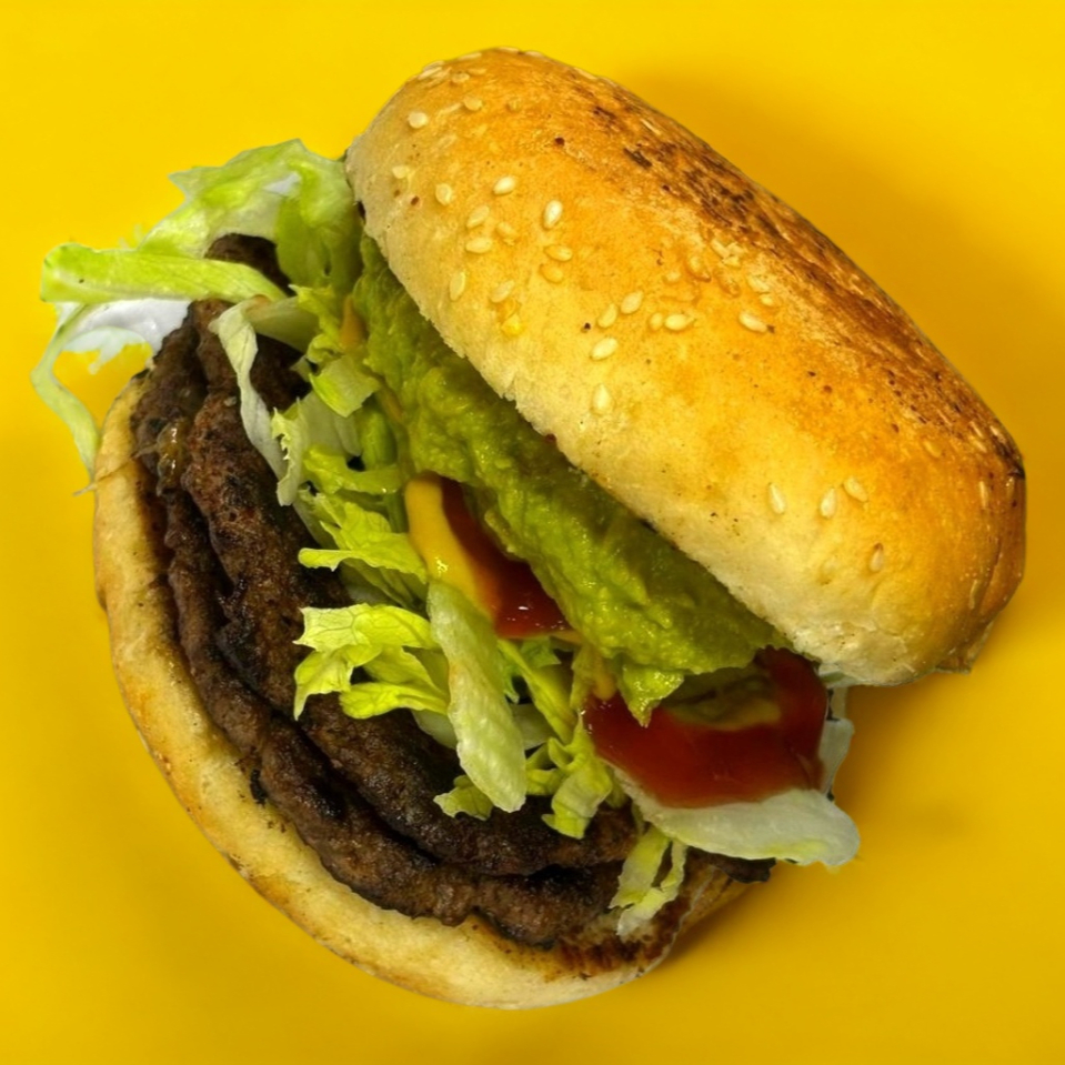 Dos carnes,doble queso,lechuga,tomate,Aguacate mayonesa, catsup, mostaza