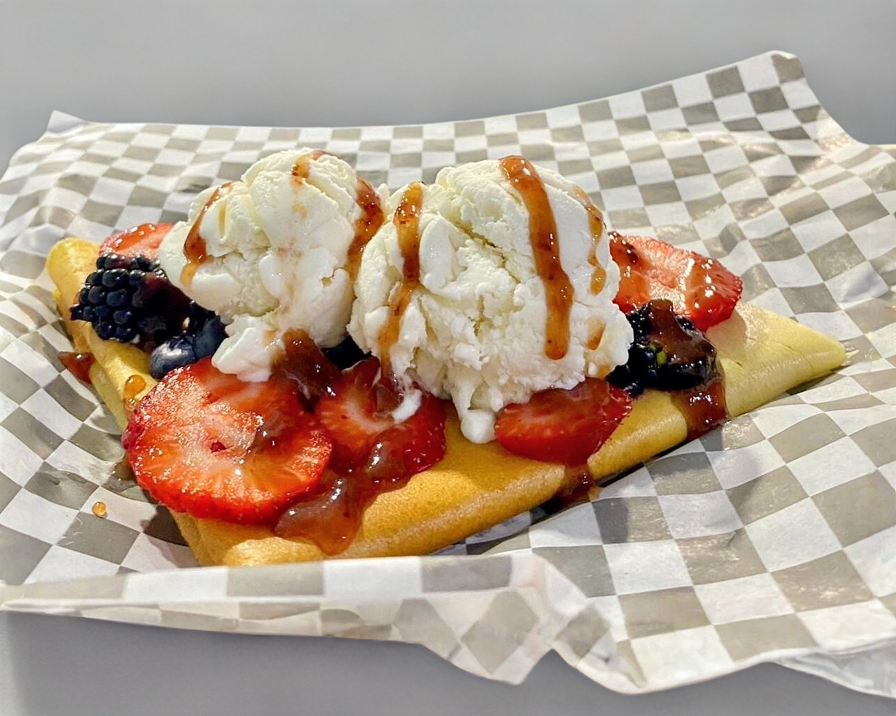 Bubble waffle relleno de una mezcla de semillas, con nieve de yogurt, topping de mermelada de fresa y crema batida.