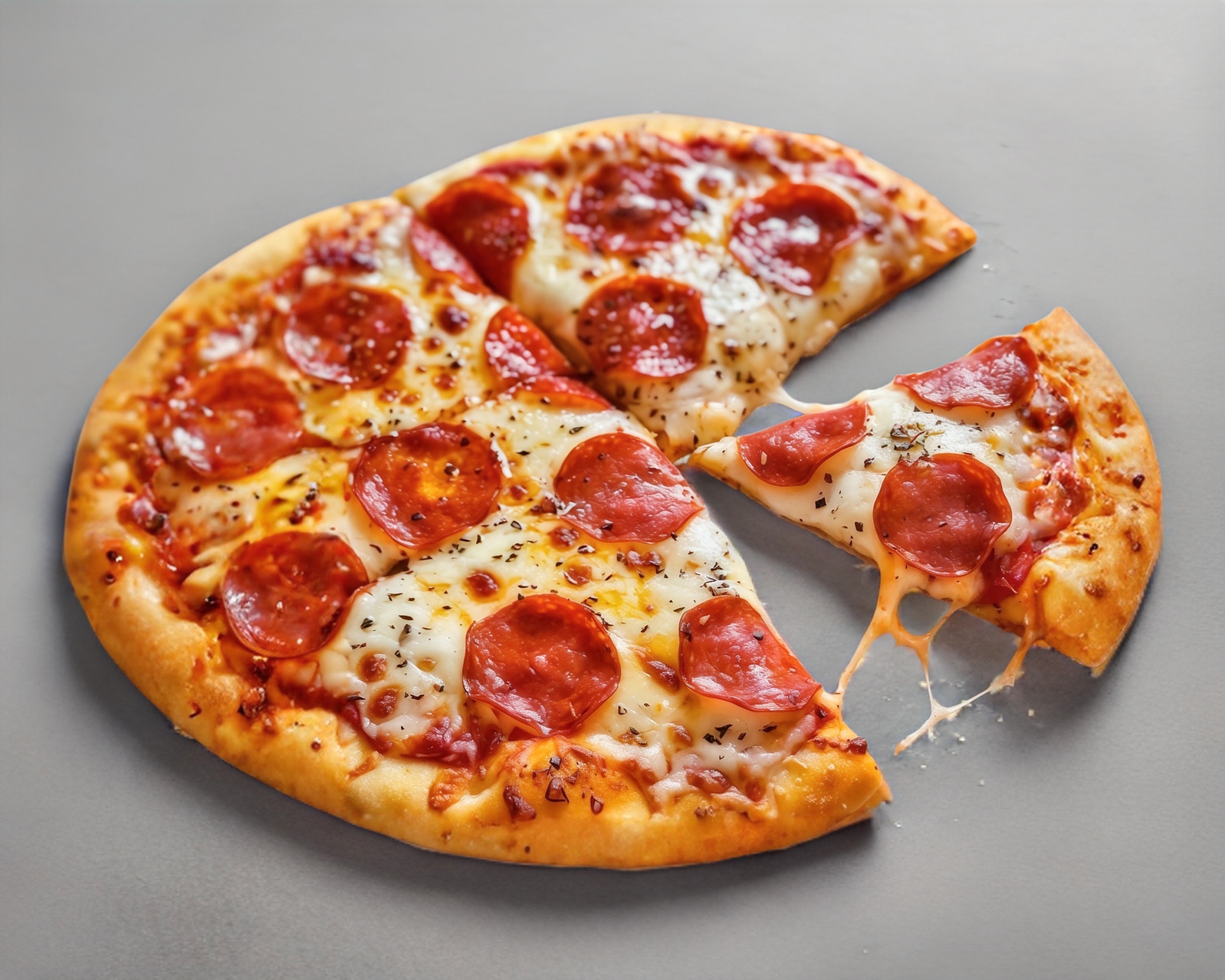 Clásica y deliciosa pizza individual cubierta con rebanadas de pepperoni crujiente, queso derretido y salsa de tomate sobre una base dorada y crujiente.
