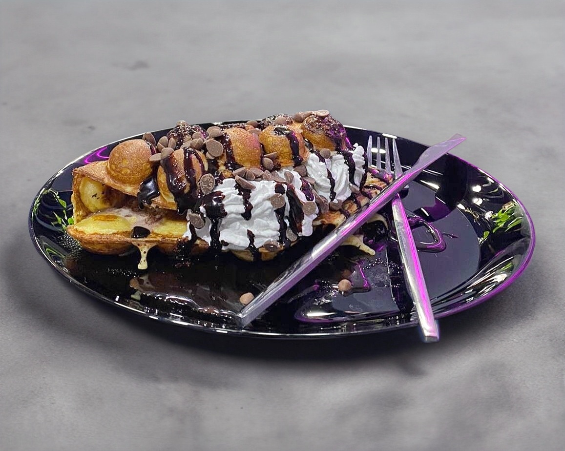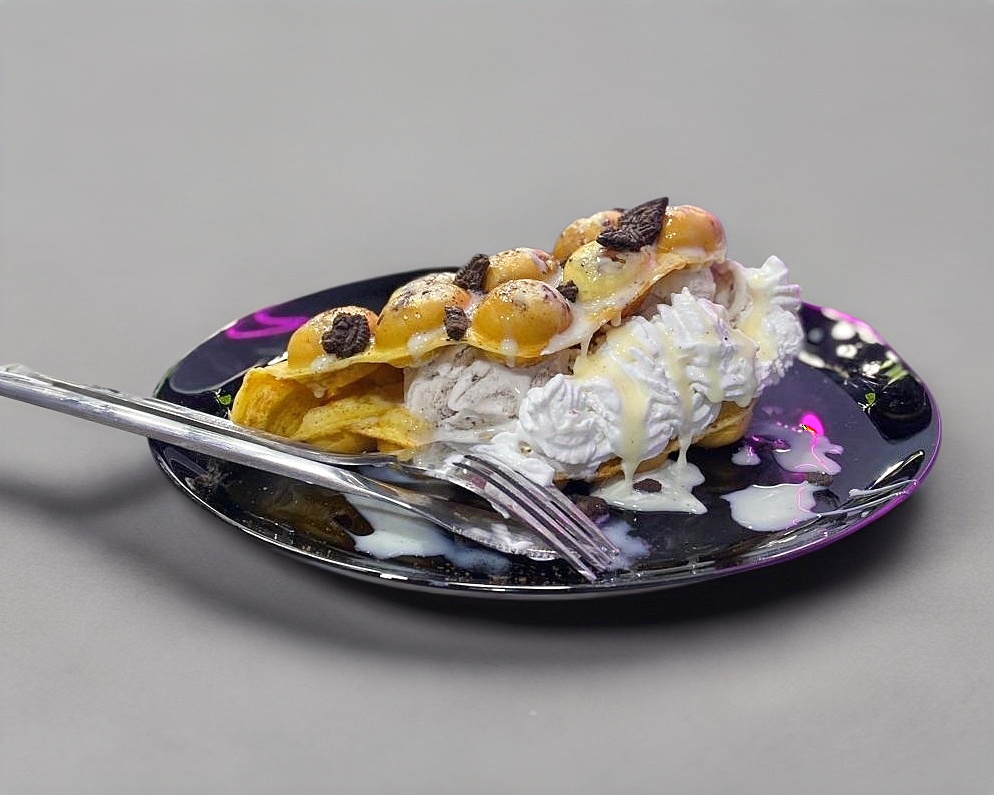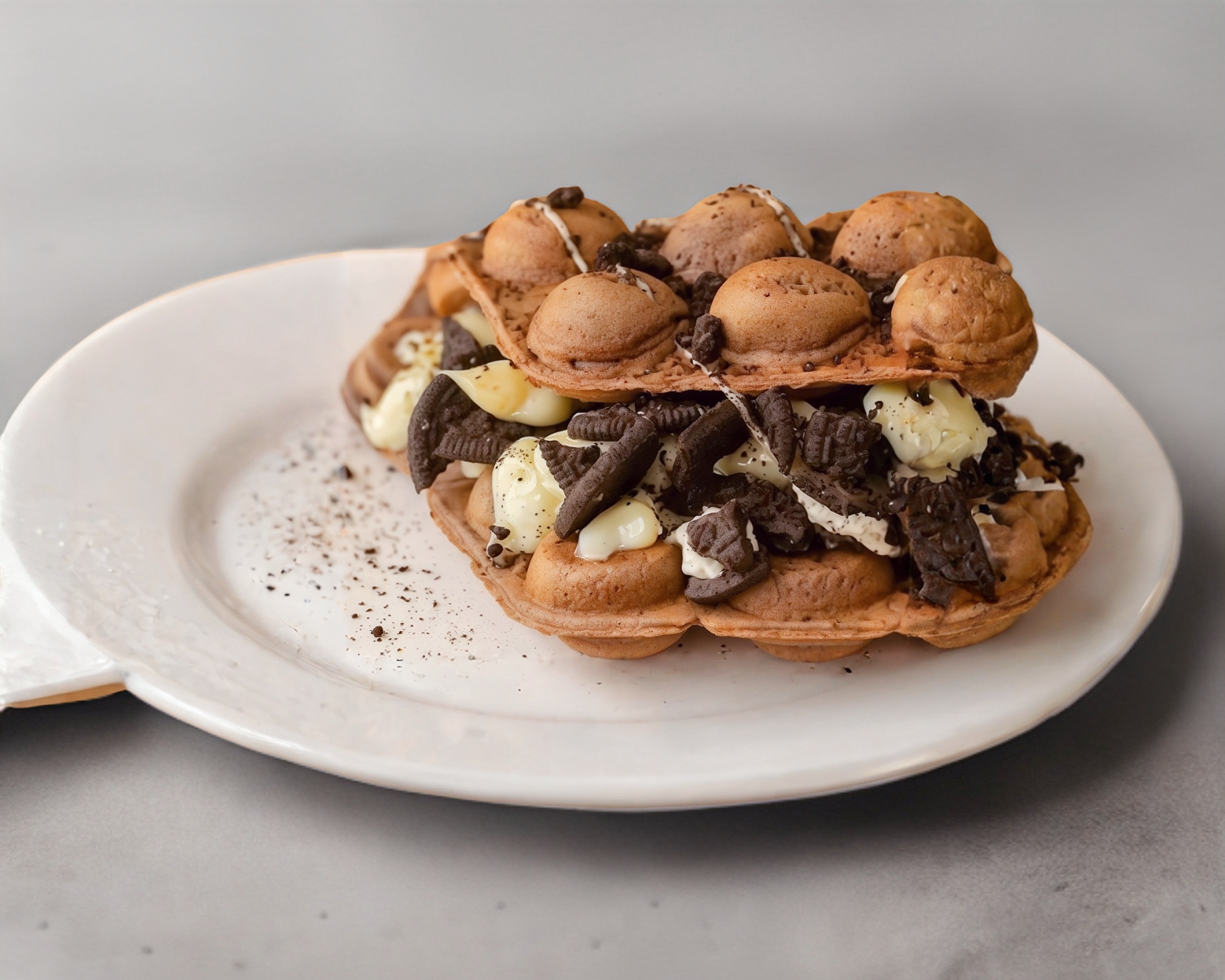 Bubble waffle relleno de oreo, con nieve de oreo, topping de lechera y crema batida.