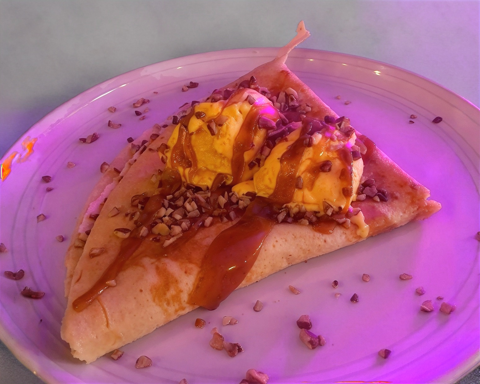 Bubble Waffle relleno de nuez, nieve de vainilla, cajeta y crema batida