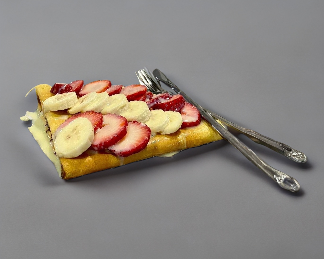 Rellena de queso crema, Nutella, cubierta de fresa, plátano y lechera.