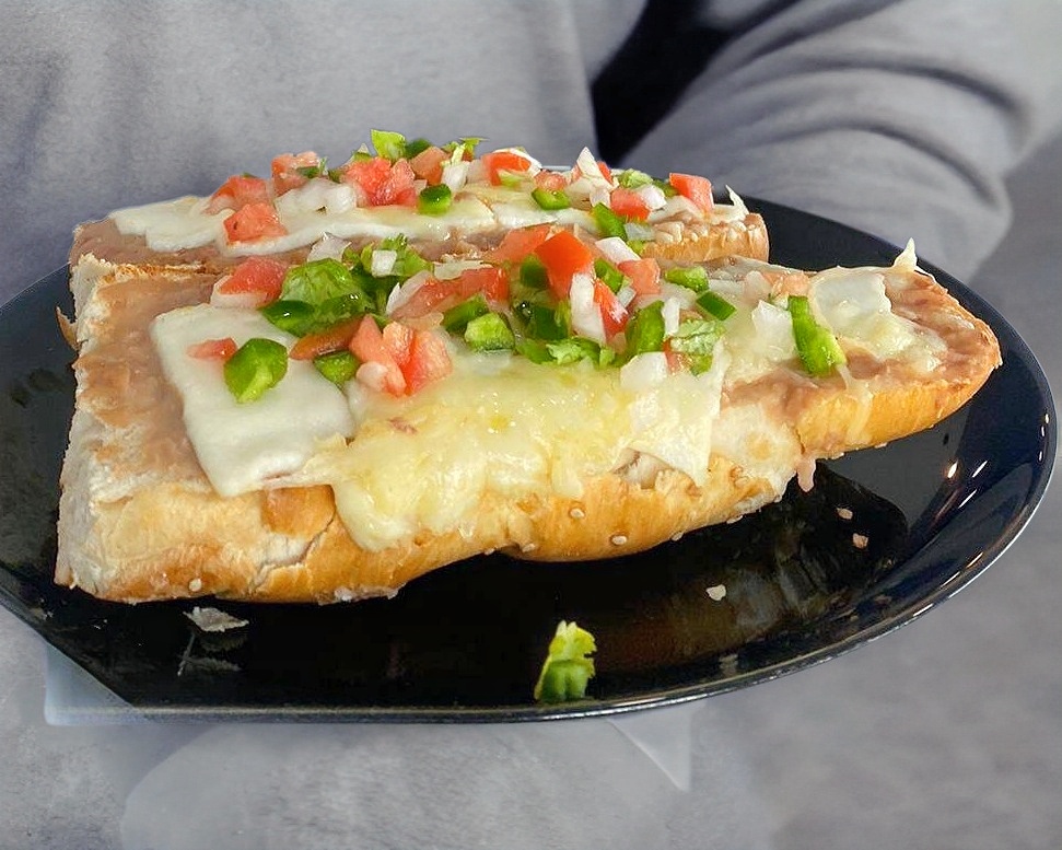 Pan con mantequilla montado con frijoles y ralladura de queso, acompañado con pico de gallo.