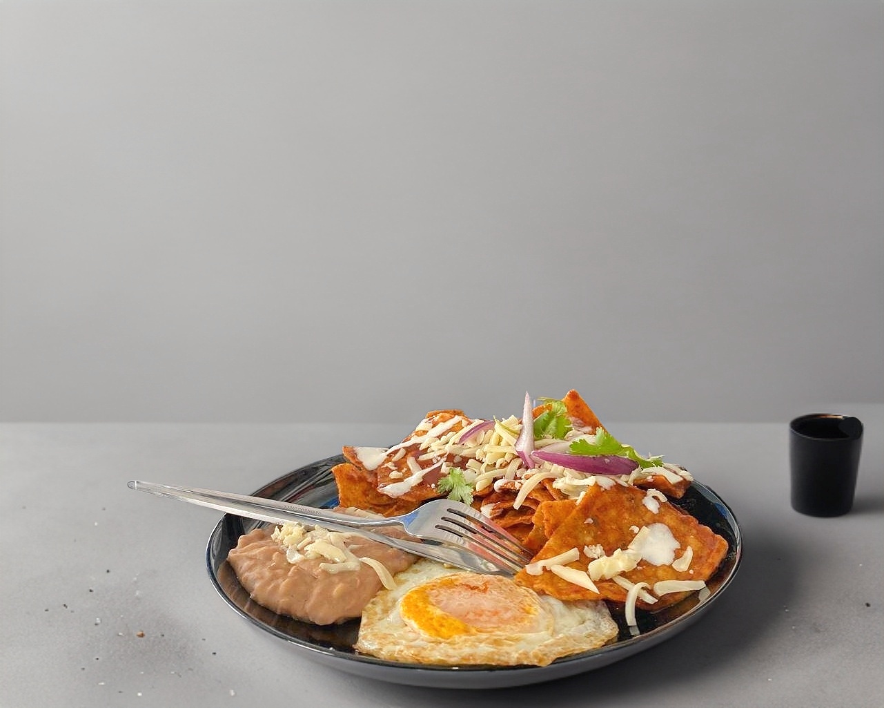 Tortilla frita bañadas de la salsa de su preferencia (verde o roja), con queso rayado, crema ácida, cebolla morada y cilantro. Acompañado con frijoles refritos y huevo.