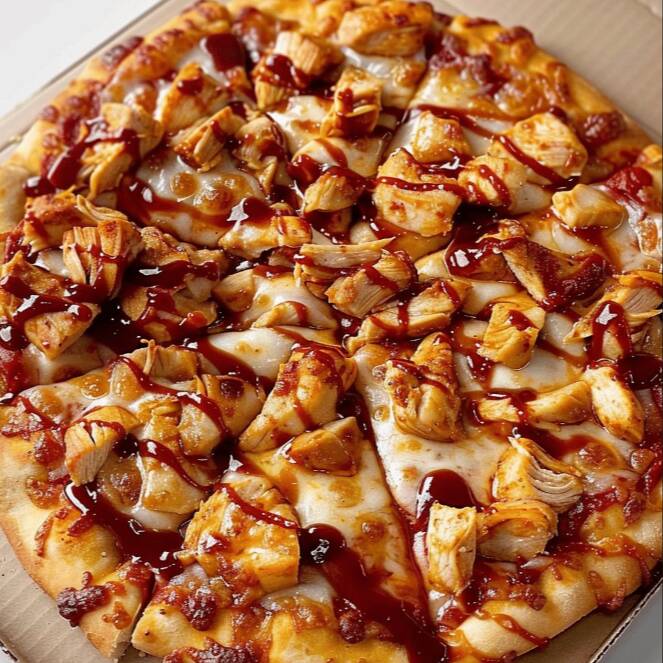 Exquisita pizza individual con trozos de pollo, bañados en salsa BBQ y queso fundido sobre una base dorada y crujiente.