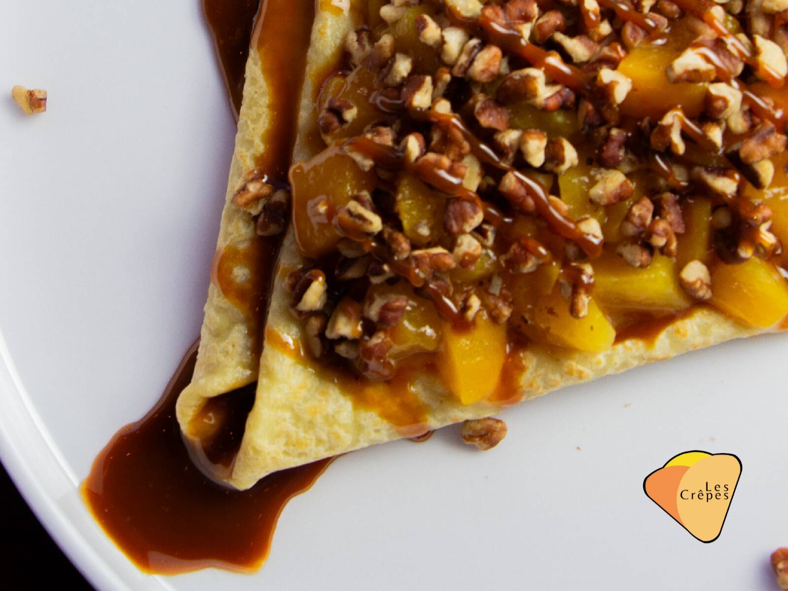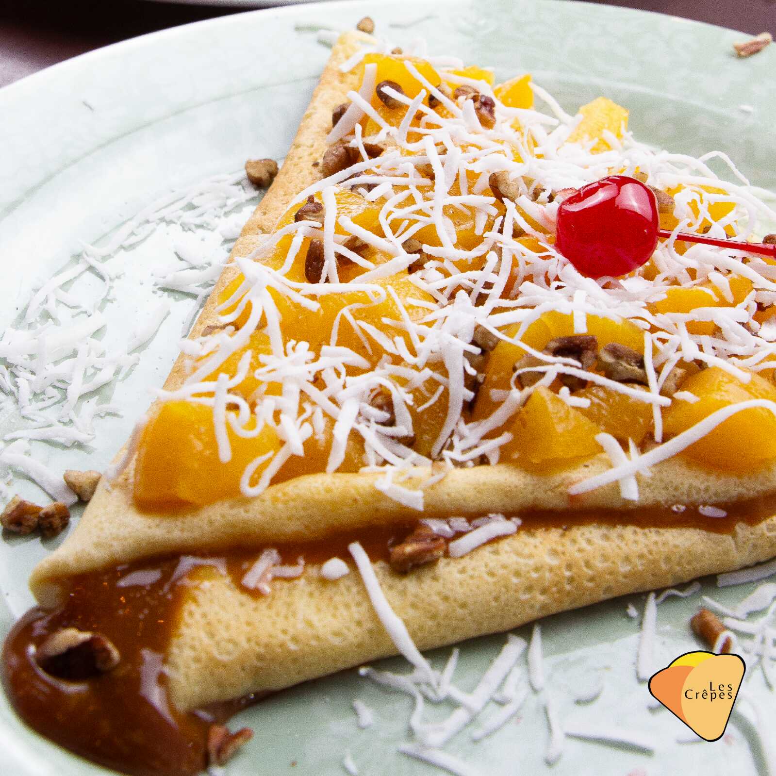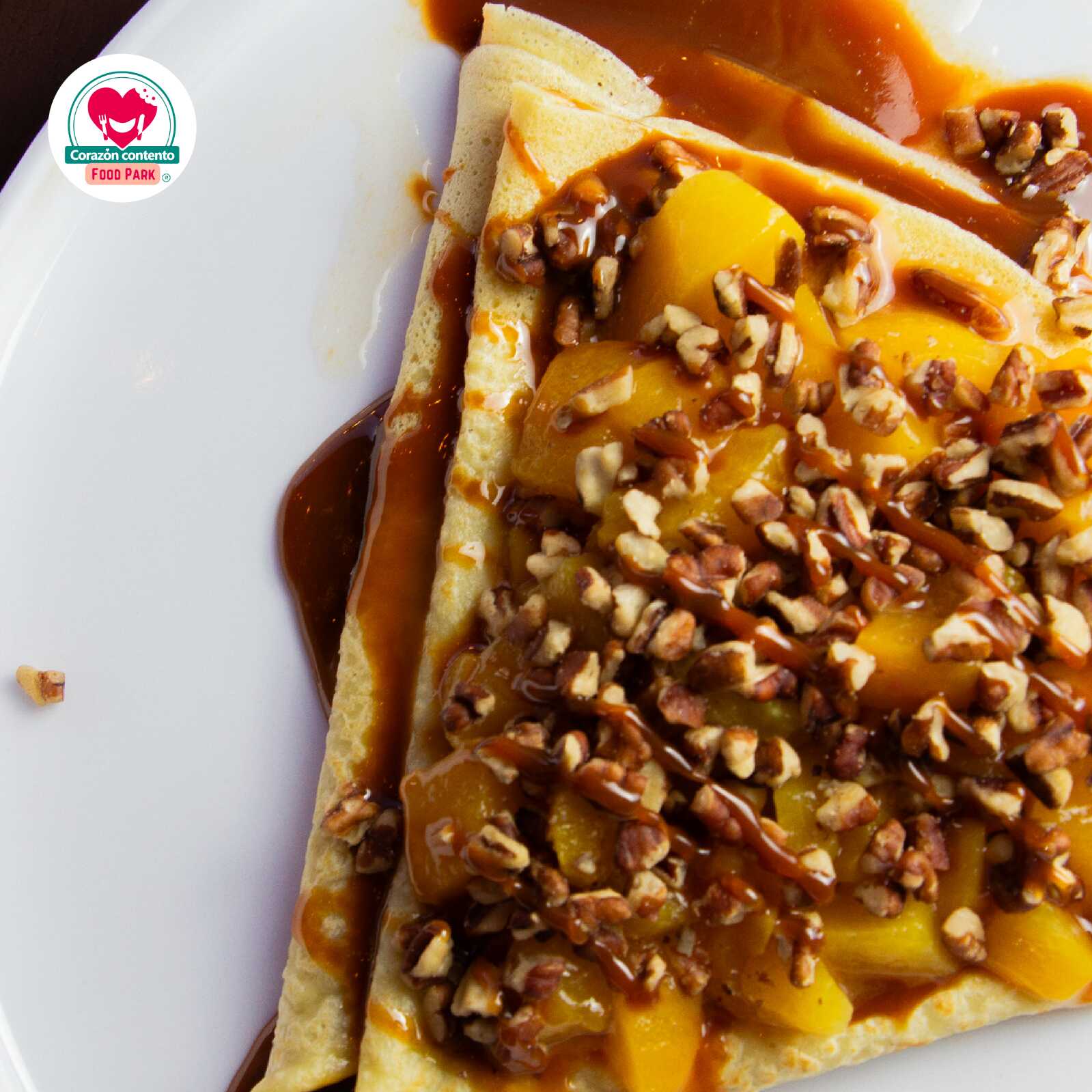 Deliciosa crepa con base de cajeta, rellena de durazno en almibar y nuez