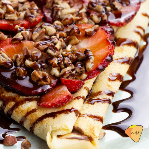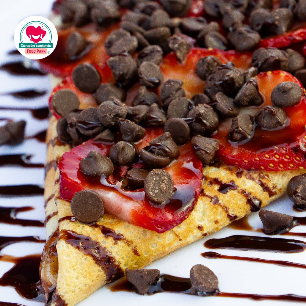 Deliciosa crepa con base de mermelada de zarzamora, rellena de fresa natural y con chispas de chocolate y chocolate líquido