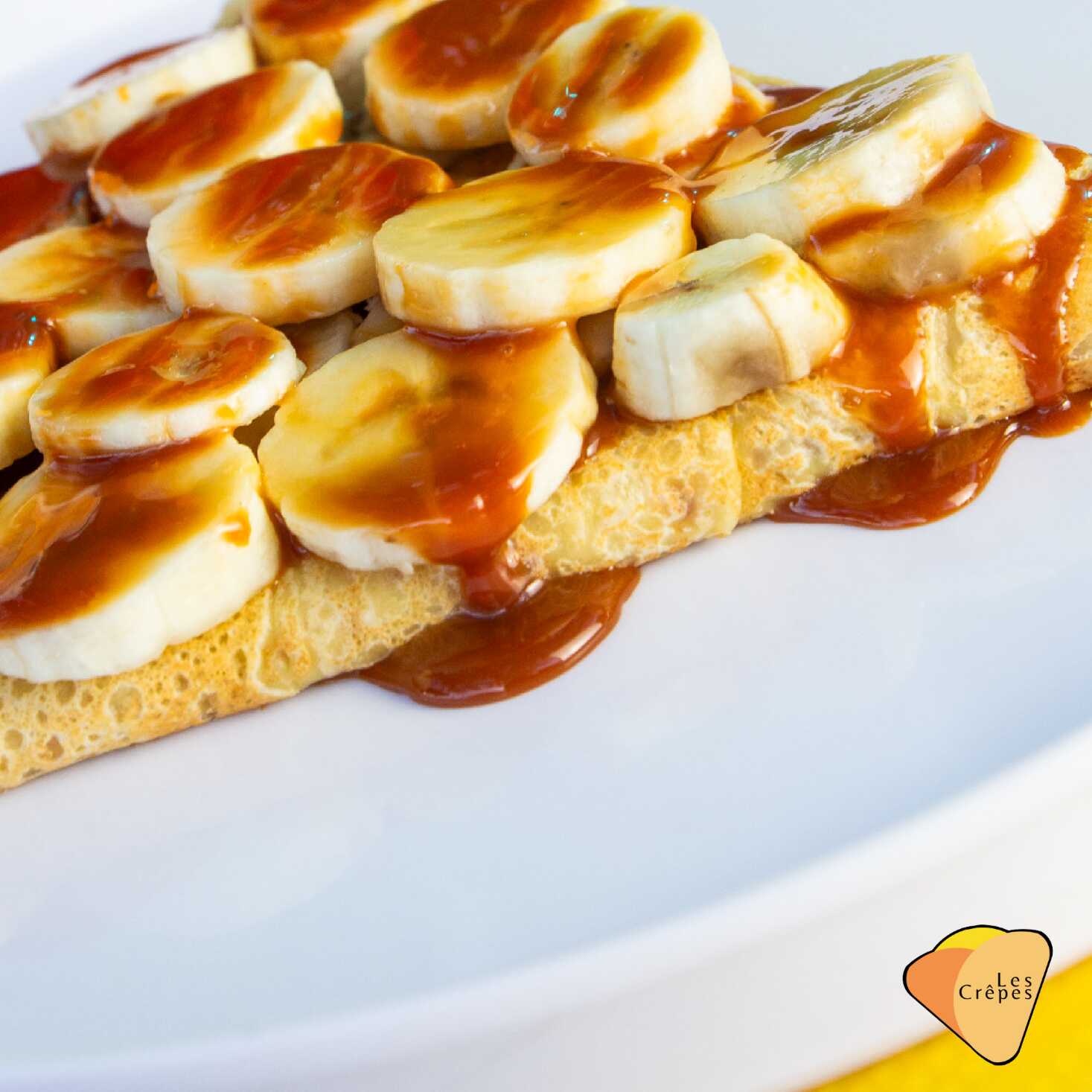 Deliciosa crepa con base de cajeta y queso crema, rellena de plátano