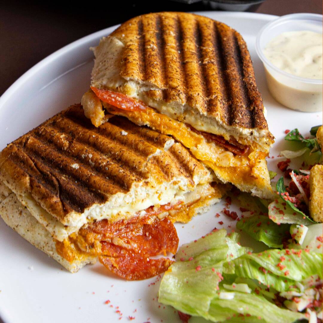 Pizza y Panini en uno sólo. Con pepperoni, queso gratinado, queso crema y salsa pomodoro casera. Acompáñalo con papas o ensalada cesar
