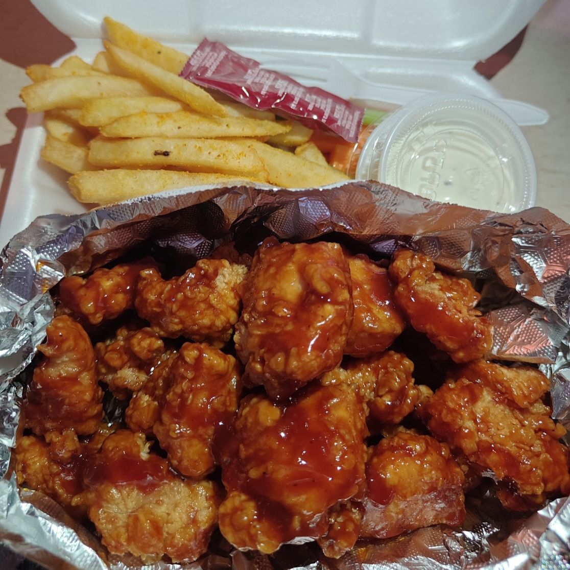 400 g de papas doradas y crujientes cubiertas con 450 g de boneless bañados en tu salsa favorita, acompañadas con salchicha para asar y dos aderezos de tu preferencia de 1.5 oz.. pruebalas