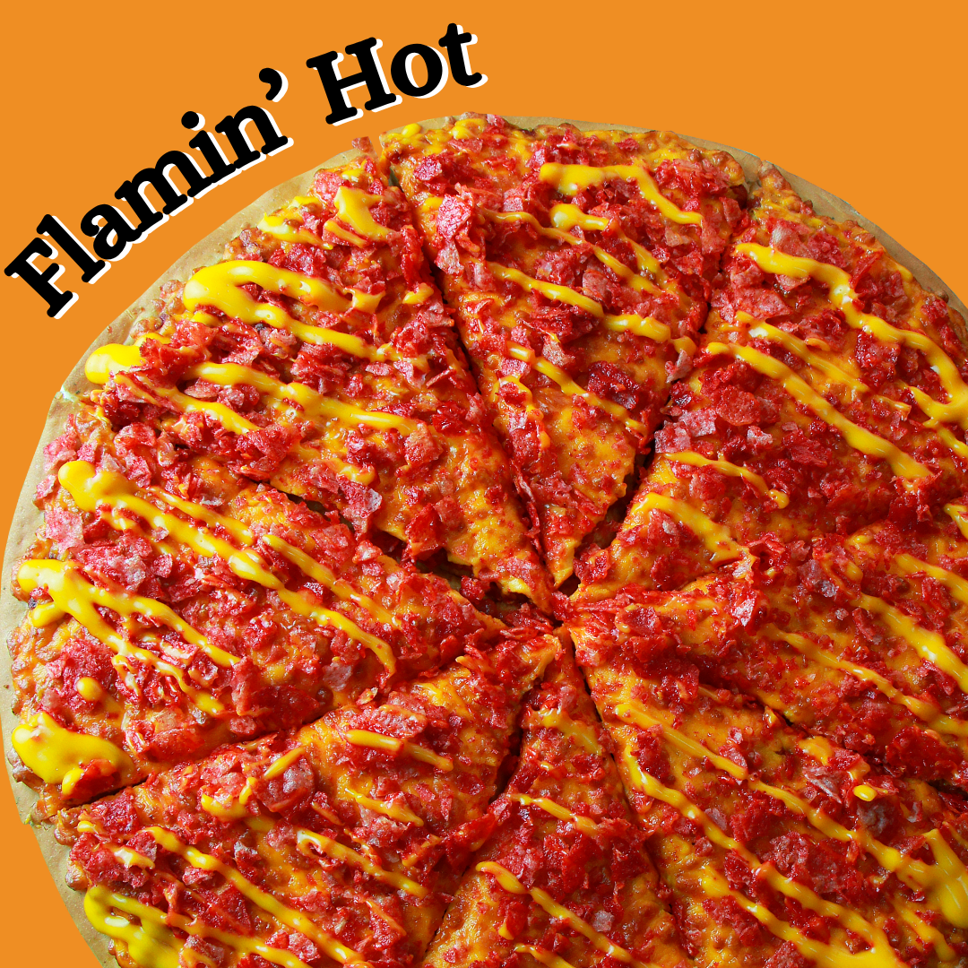 Pizza con queso cheddar, sabritas flamin hot y queso de nachos