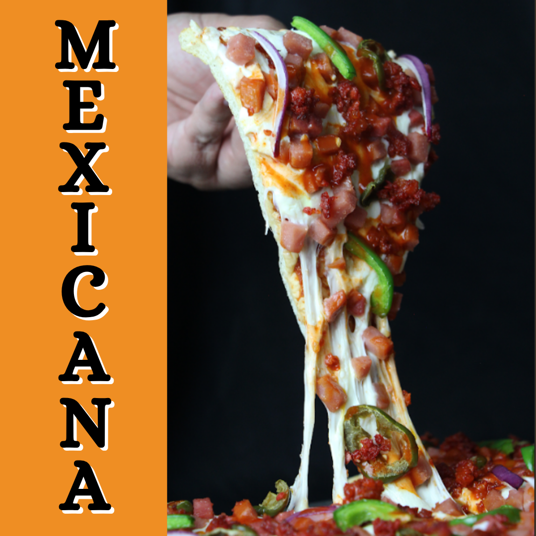 Pan artesanal con jamón, salami, jalapeño, chorizo, chile morron, cebolla morada, salsa buffalo y queso Mozzarella